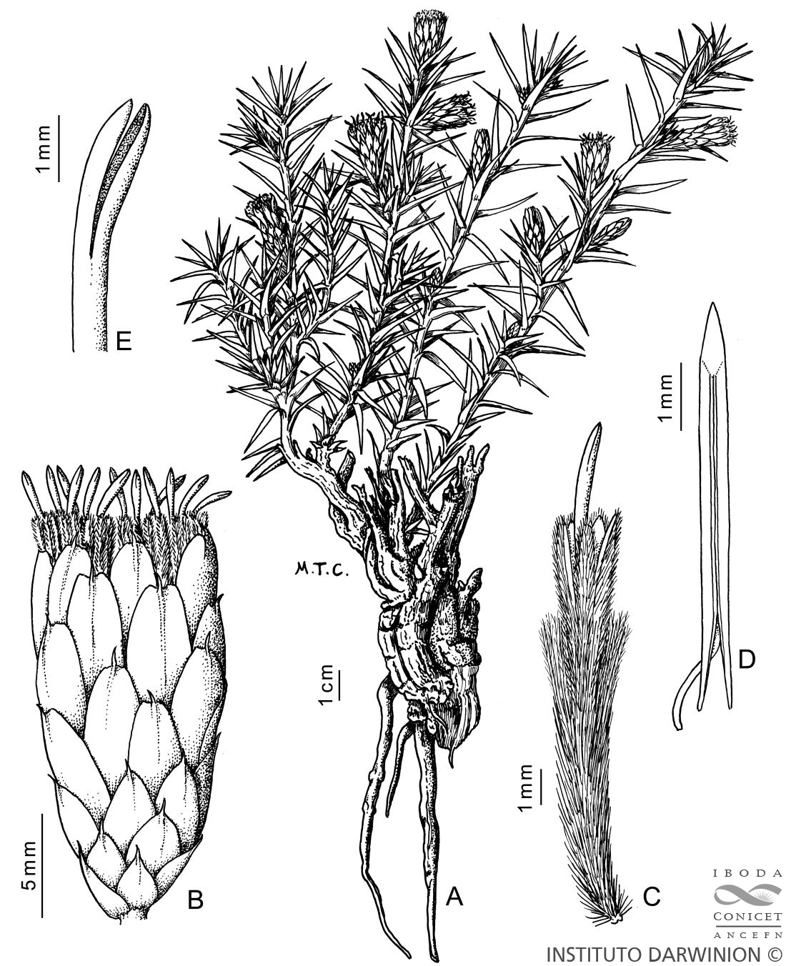 Arbustos de 30-50 cm de alto, intrincado, con ramitas jóvenes amarillentas, pubérulas, sin espinas axilares. Hojas alternas, sésiles, abiertas y rectas, lanceoladas, de 10-25 × 1,5-3 mm, subulado-espinosas en el ápice, involutas, levemente abrazadoras en la base, tomentosas en la haz, glabras y lustrosas en el envés, sin nervios prominentes, con el margen levemente engrosado. Capítulos sésiles, solitarios y terminales en el extremo de las ramitas (a veces seudo-axilares por ser éstas muy cortas). Involucro cilíndrico-turbinado, de 1,3-1,6 × 0,8-1,2 cm; filarios en 4-6 series, amarillos, todos más o menos erectos, fuertemente coriáceo-escariosos, frecuentemente lustrosos, con el margen ciliado a glabro. Flores 12-23, con corola de de 8-10 mm, exteriormente pubescente, sobre todo hacia el ápice, con un segmento más profundo. Aquenios de 3-4 mm de largo. Papus algo más corto que la corola.