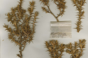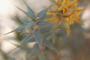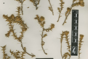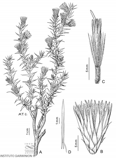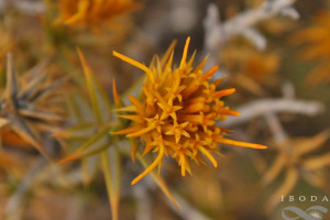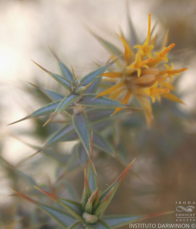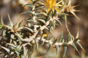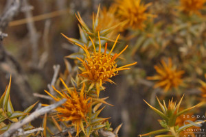 Arbustos de 30-60 cm de alto, intrincado-ramosos, con ramitas jóvenes amarillas, levemente pubescentes, sin espinas axilares. Hojas alternas, sésiles, algo recurvadas, triangularlanceoladas, de 7-20 × 2-4 mm, subulado-espinosas en el ápice, involutas, tomentosas en la haz, glabras en el envés, sin nervios prominentes, con el margen engrosado Capítulos terminales, sésiles. Involucro turbinado, de 1,3-1,8 × 0,7-1,2 cm, amarillo; filarios en 4-6 series, amarillos, los exteriores recurvados, todos coriáceo-escariosos, con el margen pubescente. Flores 12-18, con corolas de 7-10 mm de largo, exteriormente pubescentes, sobre todo hacia el ápice, con un segmento más profundo. Aquenios de 4 mm de largo. Papus casi tan largo como la corola.