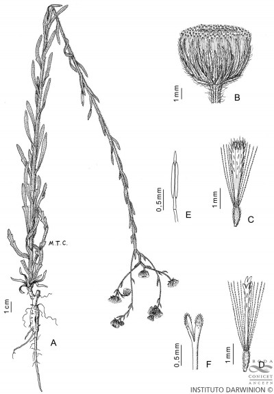 Hierbas perennes, hasta de 70 cm de alto; raíz principal desarrollada y gruesa; tallos simples, laxamente hojosos, hirsutolanosos. Hojas densamente hirsutas; las inferiores muchas veces concentradas en la base, obovadas u oblongas, de 30-95 × 6-18 mm, base atenuada, ápice subobtuso, margen serrado o lobado especialmente en el tercio superior, las superiores linearoblongas, reducidas (de 10-30 × 1-3 mm), esparcidas, algo abrazadoras, margen entero. Capítulos usualmente 5-10 por eje, a veces más numerosos, de 6-8 × 7-8 mm, pedunculados, formando en conjunto una inflorescencia secundaria corimbiforme más o menos densa. Involucro hemisférico con filarios subiguales dispuestos en 2 ó 3 series, lineares, de 5-6,5 × 0,6-0,7 mm, agudos, hirsutos, si la tercer serie presente, la externa más corta. Flores marginales en 6 series, con corola filiforme, de 3,7-4 mm de largo, apenas más larga que los filarios, limbo apenas desarrollado, ca. 0,6 mm de largo, ápice dentado; flores del centro relativamente numerosas, con corola tubuloso-campanulada, de 3,6-3,7 mm de largo. Aquenios de 2-2,3 × 0,4-0,5 mm, laxamente seríceos. Papus de 3,5-3,7 mm de largo.