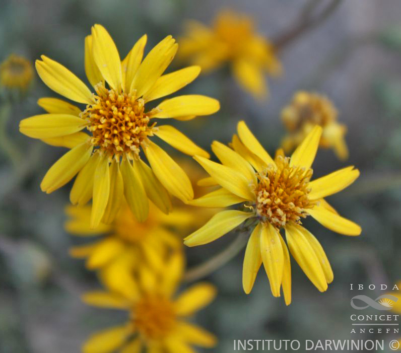 Arbustos rizomatosos, cespitosos o en forma de cojines densos. Hojas espatuladas, de 1-3,5 cm de largo, herbáceas o coriáceas, profundamente dentadas a pinnatisectas, con dientes mucronados, raro enteras, glabras o con pelos ralos, rígidos y cortos en los márgenes, con numerosas glándulas en ambas caras de la lámina. Capítulos radiados sobre pedúnculos de 1-16 cm de largo, estriados, bracteados, glabros, con numerosas glándulas. Involucro de 0,8-1 cm de alto, con filarios dispuestos en 4-5 series, lineares, inferiores a 1 mm de ancho, verdes, con bordes membranáceos blancos, mucronados, a veces ciliados o con pelos capitados en el margen, cubiertos de glándulas; los externos a veces revolutos. Flores del margen con corolas liguladas, amarillas, lígula de 6-7 mm de largo, 3-dentada en el ápice, y tubo de 4 mm, con pelos capitados, cortos, ralos; las del centro con corolas tubulosas de 6,5 mm de largo, glabras. Aquenios villosos. Papus blanco o pajizo, de 5 mm de largo.