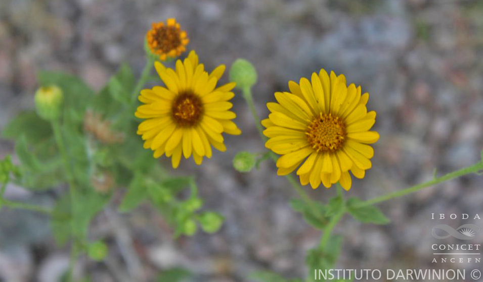 Hierbas anuales, con raiz principal desarrollada, hasta de 50 cm de alto, con tallos ramificados en el ápice, hojosos, hirsutos. Hojas ovadas o elípticas, de 15-50 × 10-25 mm, base cordada, semiabrazadora, ápice agudo, margen algo serrado o entero, hirsutas; las inferiores con pecíolo corto que lleva en su base una expansión laminar; las superiores sésiles, casi auriculadas y gradualmente menores que las inferiores. Capítulos de 6-13 × 7- 12 mm, dispuestos en una inflorescencia secundaria corimbiforme amplia y terminal, pedunculados. Involucro acampanado, con filarios dispuestos en 4-6 series, linear-ovados, de 3-6 × 0,5-1 mm, agudos, glandulosos, margen ciliado. Flores marginales con corola amarilla, de 10-11 mm de largo, limbo de 6,5-7,5 × ca. 1 mm; aquenios de 2-3 × 0,8 mm, trígonos, glabros; papus ausente. Flores del centro con corola de 4-4,5 mm de largo; aquenios de 2-3 x 0,8 mm, trígonos, pubescentes; papus formado por 2 series, la externa muy corta, la interna de 3,8-4,3 mm de largo.