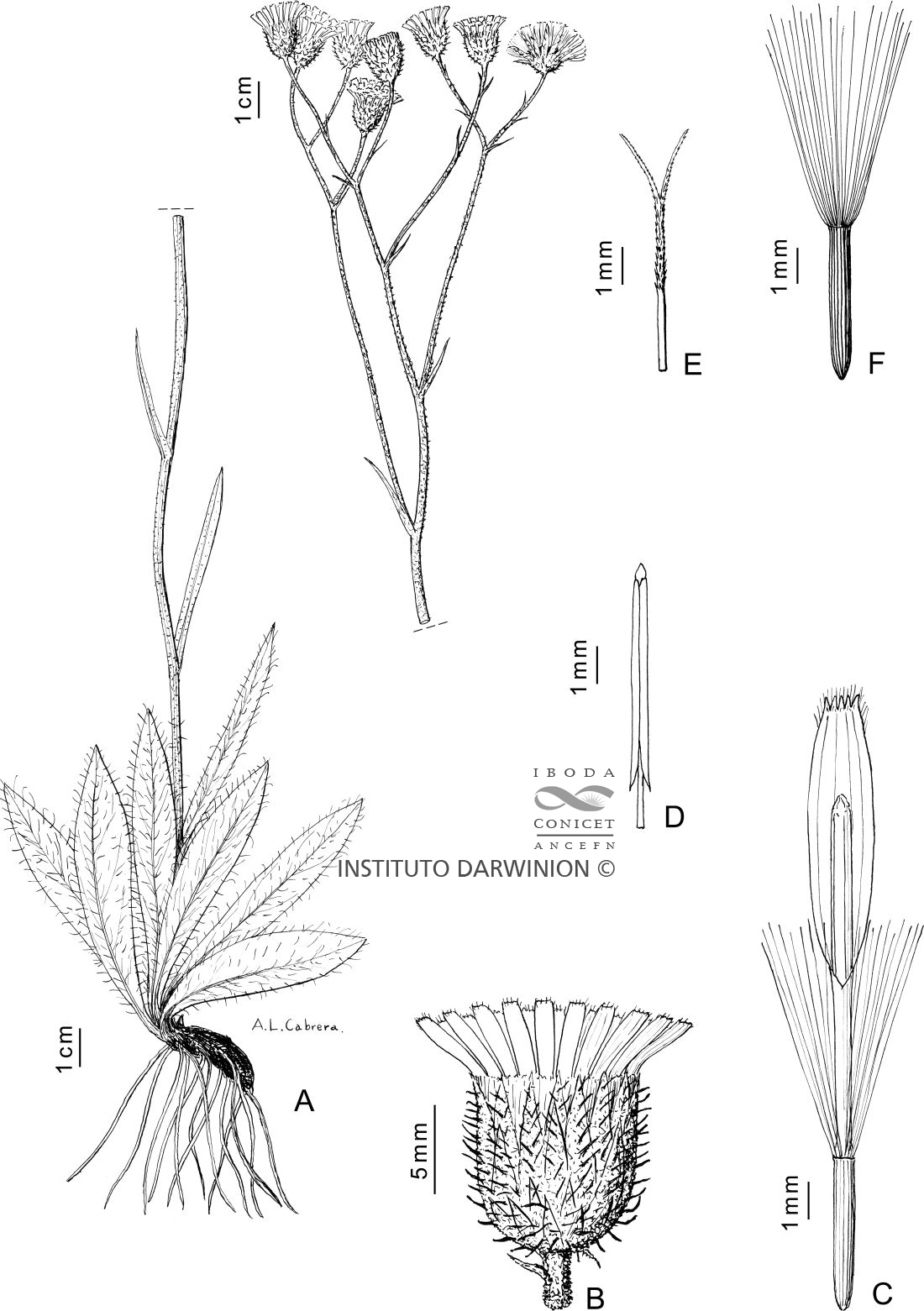 Hierbas perennes, rizomatosas, de 25-50 cm de alto. Tallos erectos, con flocosidad laxa y pelos setosos largos, dispersos. Hojas basales en roseta, oblanceoladas, de 10-15(-18) × 2 cm, largamente atenuadas en pseudopecíolo, setosas y glandulosas en haz y envés. Capítulos dispuestos en una cima corimbiforme paucicéfala terminal. Involucro acampanado de 11-12 × 10-12 mm; filarios lanceolados, agudos, lanosos, con pelos simples y glandulares de base negra. Flores amarillas, con lígulas exertas, ciliadas en el ápice. Aquenios lisos, negros, de 4-4,5 mm de largo. Papus amarillento ca. 6 mm de largo.