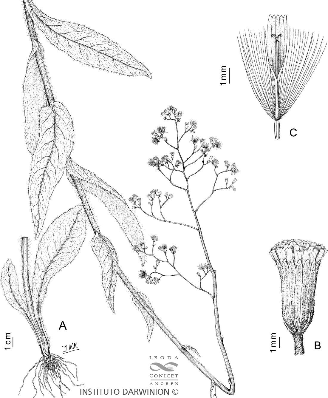 Plantas robustas, rizomatosas, de 40-70 cm de alto. Tallos erectos, simples, con cerdas en la mitad inferior, a partir de la cual se encuentran pelos glandulares cortos y estrellados dispersos. Hojas basales oblanceoladas, de 13-22 × 3-5(-6) cm, pseudopecioladas, obtusas o agudas en el ápice, enteras o denticuladas en el margen, con pelos simples, en menor proporción en la haz; hojas caulinares abrazadoras en la base, enteras o denticuladas en el margen, laxamente pilosas, gradualmente menores hacia el ápice. Capítulos dispuestos en inflorescencias tirsoideas pluricéfalas; pedúnculos flocosos con escasos pelos glandulares dispersos. Involucro cilíndrico de 6- 8 × 2-4 mm; filarios lineares, semiobtusos, flocosos en la base y glabros en el ápice, excepcionalmente, con algún pelo glandular. Flores amarillas, con lígula corta. Aquenios negros, multicostados, espinulosos, de 3-4 mm de largo. Papus blanco o amarillento, ca. 5 mm de largo.