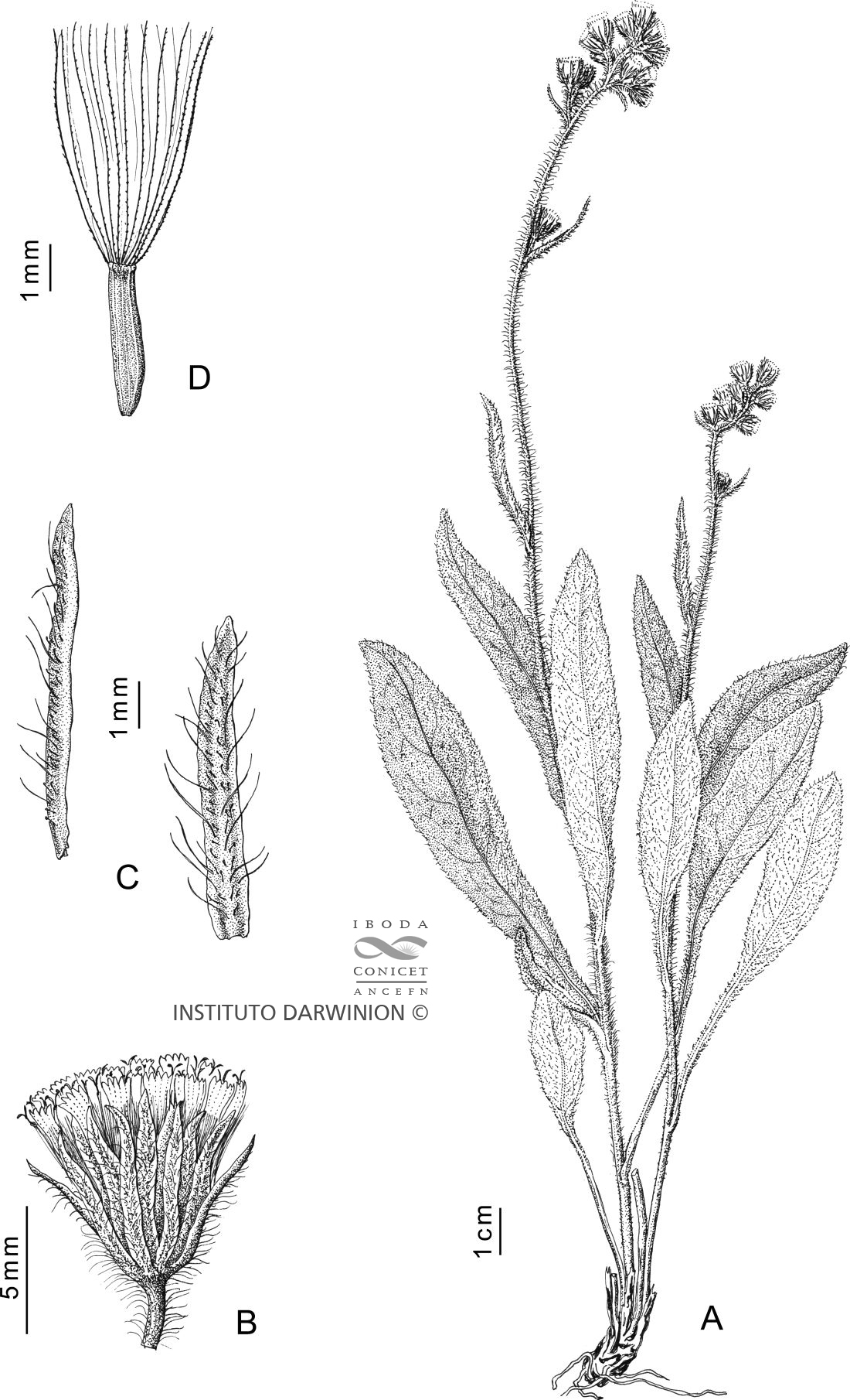 Hierbas perennes, rizomatosas, erectas, de 20-45 cm de alto. Tallos ramificados en la parte superior, densamente flocosos, con cerdas largas y pelos glandulares de menor longitud. Hojas lanceoladas, de 7-15 × 1-1,5 cm, atenuadas en la base en pseudopecíolo, agudas a acuminadas en el ápice, denticuladas o enteras en el margen, microglandulosas y setosas en haz y envés. Capítulos dispuestos en cimas corimbiformes paucicéfalas, laxas. Involucro acampanado, de 7-8(-10) × 6-8 mm; filarios lineares, agudos, flocosos como el pedúnculo, con pelos glandulares y cerdas, estas últimas ocasionalmente escasas o ausentes. Flores amarillas, con lígulas cortas, poco sobresalientes del involucro. Aquenios negros, de 2,5-3 mm de largo. Papus amarillento, ca. 5 mm de largo.
