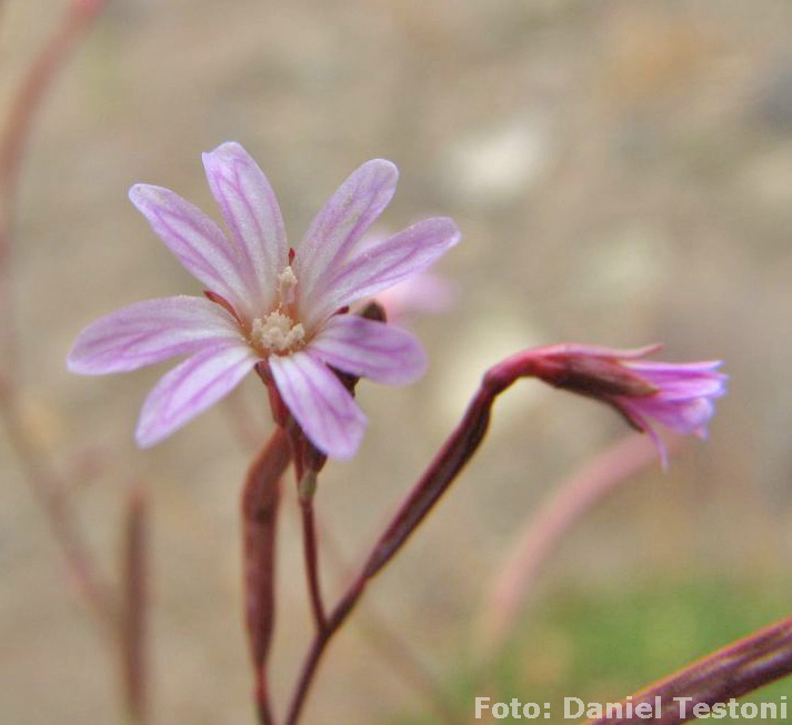 Hierba de 30-60 cm alt., erecta, anual. Raíz axonomorfa larga. Tallos ramosos arriba, a menudo algo leñosos en la base, con epidermis conspicuamente exfoliada. Hojas de 1-3,5 cm x 2- 4,5 mm, generalmente alternas, solo unas pocas en los nudos inferiores opuestas, gradualmente reducidas hacia arriba con fascículos de hojas pequeñas en las axilas de las hojas caulinares, rápidamente caedizas, lineares a estrechamente lanceoladas, a menudo conduplicadas, acuminadas, oscuramente denticuladas, con 3-10 dientes a cada lado, glabras, pecíolos de 0,3 mm. Inflorescencia erecta, paniculada, las hojas que sostienen las flores reducidas a brácteas subuladas, adheridas a la base del pedicelo 1-2 mm. Sépalos de 2-2,7 x 0,8-1 mm, lanceolados. Pétalos de 3-4 x 1,2-2 mm, rosa purpúreos, obovados. Ovario de 0,9-1,6 cm, erecto, glanduloso-pubescente o glabro; pedicelos de 1-6 mm. Cápsula de 1,9-3,2 cm x 1,3-1,7 mm, erecta, glanduloso-pubescente o glabra; pedicelos de 3-9 mm. Semillas de 1,4-1,6 mm, maculadas, gris-pardas, finamente papilosas con una constricción conspicua en el extremo micropilar; coma de 5-7 mm, blanca o pardo-amarillenta, fácilmente desprendida.