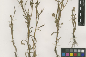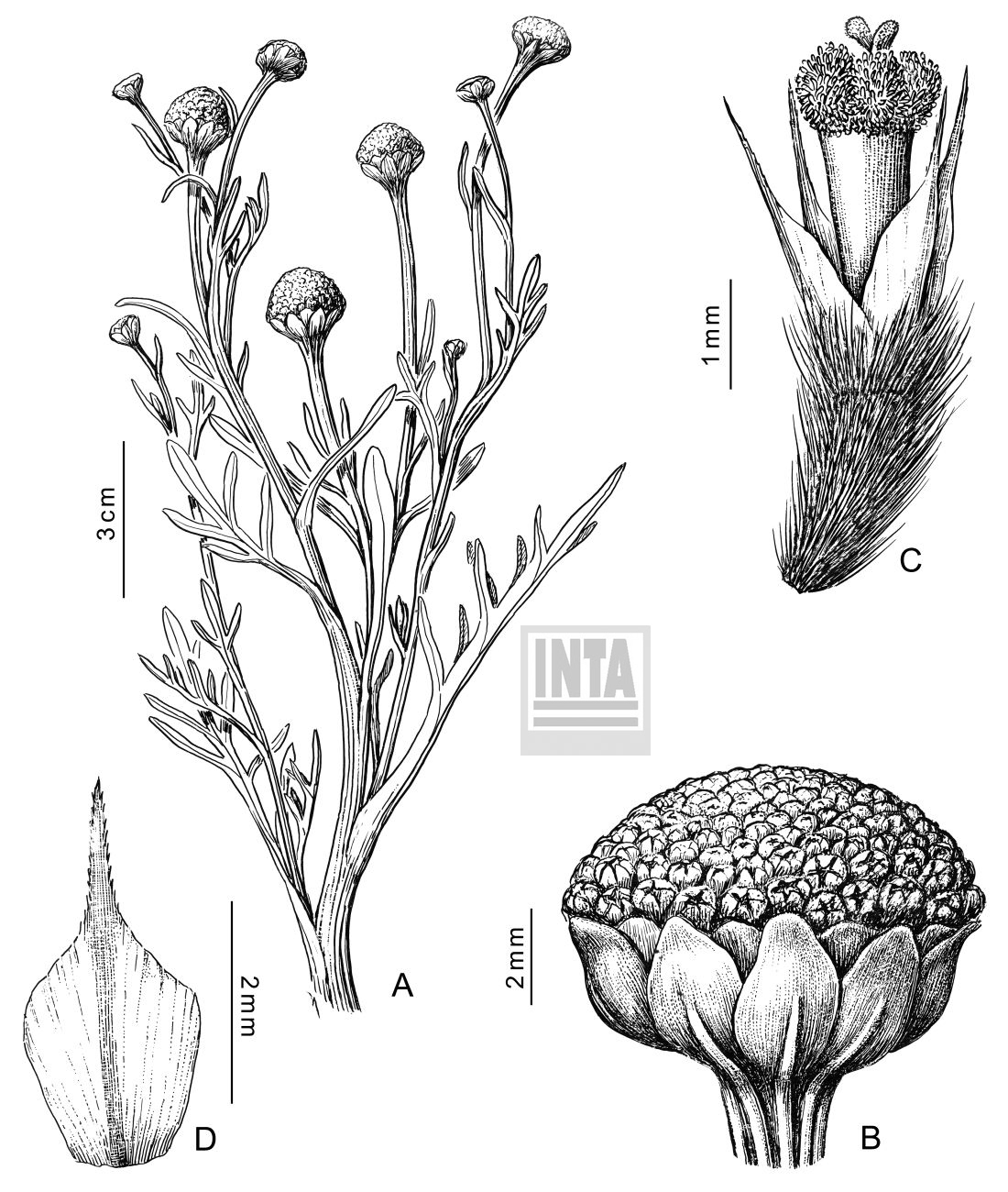 Hierbas anuales, de 20-50 cm de alto, con tallos erectos, simples, generalmente no ramificados, hojosos hasta el ápice, costados, glabros o pubérulos. Hojas alternas, pecioladas, con pecíolos de 2,5-4 cm de largo, las basales algo arrosetadas, semienvainadoras y con bases foliares persistentes, y las caulinares dispersas; láminas generalmente pinnatisectas, con contorno ovado, obovado o elíptico, de 4 × 3-4 cm, raquis y segmentos lineares, hasta de 1,5-2,5 × 0,1-0,2 cm, margen entero, algo crasos, glabros o pubérulos. Capítulos homógamos, discoides, solitarios en las axilas de las hojas superiores, largamente pedunculados, pedúnculo de 3,5-7(-11) cm de largo, algo engrosados en la parte apical. Involucro hemisférico, de 6-7(-10) × 9-12(-13) mm; filarios 14-18, 2-seriados, (7-)8(-9) en cada serie, los externos ovados o elípticos, de 4-5(-6) × 2,5-3 mm, ápice agudo, unidos en la base, pubescentes, los internos obovados, ca. 6 × 2 mm, generalmente más largos que los externos, ápice agudo, libres, pubescentes. Receptáculo algo convexo o cónico en el centro, glabro. Flores 115-200, isomorfas, perfectas, generalmente sobrepasando el involucro, con corola tubulosa, de 2,4-2,5(-3) mm de largo, amarilla, pubescente, 5-lobada, con lóbulos de 0,3-0,5 mm de largo. Aquenios obovoides, de 1,8-2 × 0,5 mm, densamente pubescentes. Papus formado por 5-7 páleas, angostamente obovadas o elípticas, de 2,2(-3) × 0,5-0,7 mm, casi tan largas como la corola o sobrepasándola levemente, libres, hialinas, persistentes, margen eroso o fimbriado, ápice aristado, con arista ca. 0,5 mm de largo.