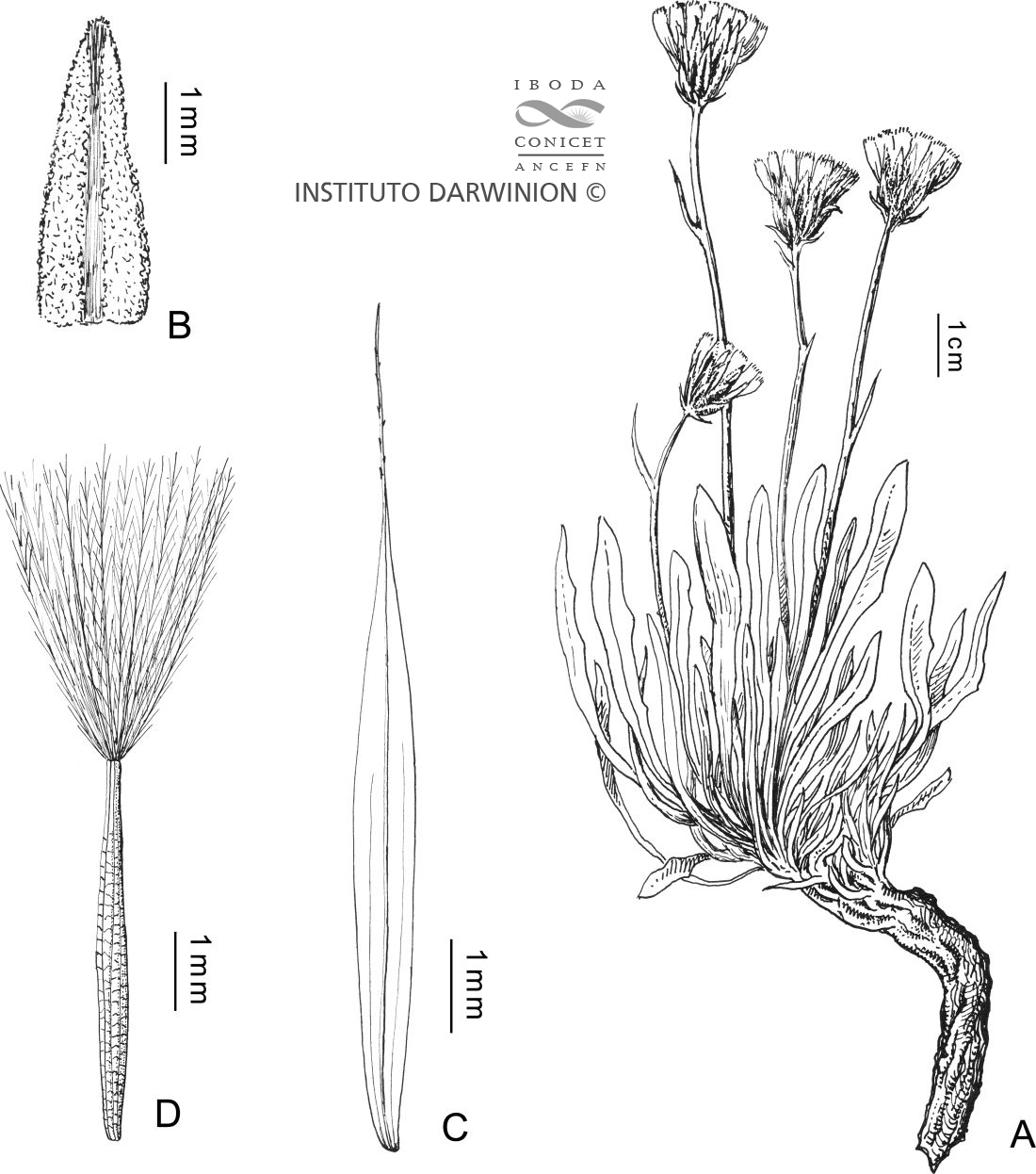 Hierbas perennes, cespitosas, hasta de 30 cm de alto, con rizoma grueso y dividido, con varias rosetas de hojas; tallos escapiformes, estriados, con pocas bractéolas pequeñas o ausentes, glabros o tomentosos. Hojas basales linear-oblanceoladas, de 20-85 × 1-6 mm, base largamente atenuada en pseudopeciolo, obtusas o poco agudas y mucronadas, enteras o sinuadas, poco dentadas, glabras. Capítulos solitarios. Involucro acampanado, de 12-23 × 6-9 mm; filarios 4-5-seriados, los externos oblongo-lanceolados, con margen incano-tomentoso; páleas del receptáculo de 10-12 mm de largo. Flores más largas que el involucro; corola amarilla o amarilloanaranjada, de 15-24 mm de largo; lígula más larga que el tubo de la corola. Aquenios isomorfos, contraidos en el ápice, de 2-3,5 mm de largo y pared lisa. Papus 1-seriado, 7-11 mm de largo.