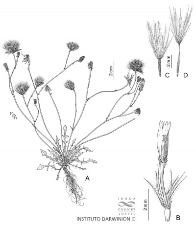 Hierbas anuales, de 10-50 cm de alto, tallo escapiforme, con bracteas lineares, glabro. Hojas basales en roseta, cortamente pecioladas, obovadas, de 15-110 × 4-30 mm, base atenuada, ápice obtuso, con margen sinuado-dentado, glabras o hirsutas. Capítulos comúnmente solitarios o en cimas. Involucro cilíndrico, de 7-16 × 5-19 mm; filarios 4-5-seriados, los externos lanceolados u oblongo-lanceolados. Flores poco más largas que el involucro; corolas blancas o amarillas, de 5-10 mm de largo; lígula más corta que el tubo de la corola; páleas del receptáculo ca. 10 mm de largo. Aquenios dimorfos, con pared escamosa, los exteriores erostrados, de 3-4 mm de largo, los centrales rostrados, de 6,5-8 mm de largo. Papus 2-seriado: los elementos de la serie externa simples y cortos, los de la serie interna largos y plumosos, de 9- 10 mm de largo.