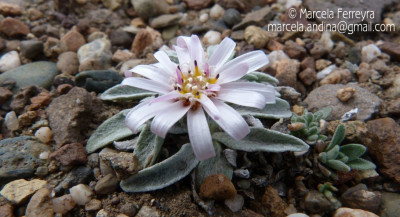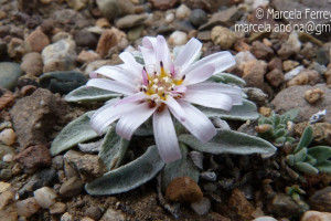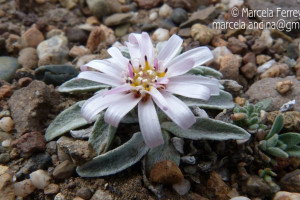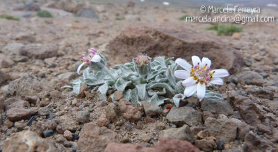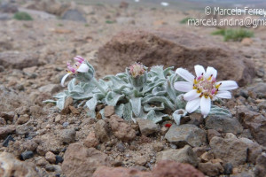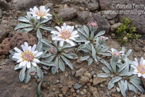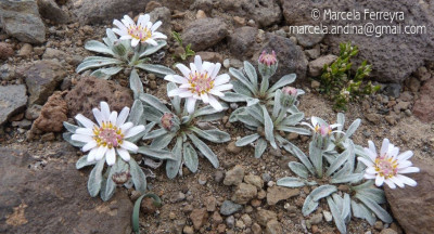 Hierbas perennes, hasta de 4 cm de alto, acaules; escapos cortos, áfilos, blanco-tomentosos y glandulosos. Hojas dispuestas en roseta basal, espatuladas, de 7-10 cm × 6-9 mm, atenuadas en corto pecíolo en la base, obtusas en el ápice, crenado-dentadas en el margen, con 1-3 dientes cortos a cada lado, densamente albotomentosas en ambas caras. Capítulos solitarios, subsésiles. Involucro hemisférico, ca. 10 × 15 mm; filarios 2-seriados, lanceolados, agudos, densamente lanosos y con algunos pelitos glandulares. Flores 34-42, corola blanco-rosada o purpúrea, las del margen con tubo de 4-5 mm de largo, labio exterior de 2-7 × 2 mm. Aquenios obovoides, papiloso-pubescentes. Papus blanco, cerdas plumosas desde la base, de 5-6 mm de largo.