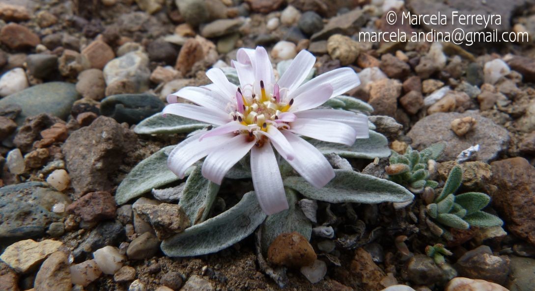Hierbas perennes, hasta de 4 cm de alto, acaules; escapos cortos, áfilos, blanco-tomentosos y glandulosos. Hojas dispuestas en roseta basal, espatuladas, de 7-10 cm × 6-9 mm, atenuadas en corto pecíolo en la base, obtusas en el ápice, crenado-dentadas en el margen, con 1-3 dientes cortos a cada lado, densamente albotomentosas en ambas caras. Capítulos solitarios, subsésiles. Involucro hemisférico, ca. 10 × 15 mm; filarios 2-seriados, lanceolados, agudos, densamente lanosos y con algunos pelitos glandulares. Flores 34-42, corola blanco-rosada o purpúrea, las del margen con tubo de 4-5 mm de largo, labio exterior de 2-7 × 2 mm. Aquenios obovoides, papiloso-pubescentes. Papus blanco, cerdas plumosas desde la base, de 5-6 mm de largo.