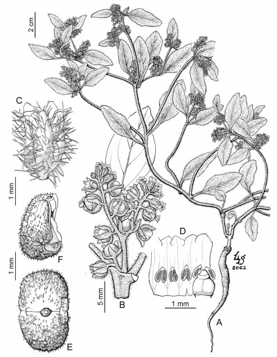 Hierba anual o bianual hasta de 50 cm de alto, densamente híspida con pelos hasta de 1 mm de largo; tallos decumbentes. Hojas alternas o subopuestas; pecíolos de 5-15 mm de largo; láminas ovadas, de 2,5-4 × 1-2 cm, densamente híspidas, cartáceas, ápice agudo, base aguda, el margen revoluto, liso. Inflorescencias en cincinos globuloriformes, de 1,5 cm de largo, sésiles, paucifloros, de 1-15 flores. Flores con cáliz de 1,5-2 mm de largo, lacinias triangulares, con el ápice agudo, híspidas; corola infundibuliforme blanca, tubo de 2 mm de largo, externa e internamente glabra, limbo de 1 mm de diámetro, lóbulos redondeados; anteras elipsoidales de 0,4 mm de largo; ovario ca. 0,75 mm de largo, estigma pubescente con reborde basal suave. Fruto subgloboso, de 2,5-3 × 2,5-3 mm, glabro, dividido a la madurez en 2 mericarpos 2-seminados.