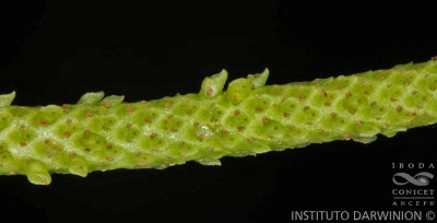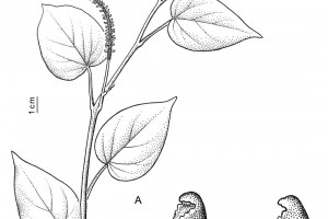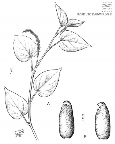 Hierbas terrestres o rupícolas, rastreras; tallos ramificados, con entrenudos de 2-5(-7) cm de largo, glabros a levemente pulverulentos en los nudos. Hojas alternas, con pecíolos de 1-4 cm de largo, canaliculados, ciliados; láminas ovado-lanceoladas, a veces asimétricas, de 2,5-6 × 2-3,5 cm, base levemente cordada a redondeada, ápice acuminado, cartáceas, con el nervio medio marcado, ciliadas hacia el ápice. Inflorescencias axilares, compuestas por 2 espigas de 7-12 cm de largo, a veces una de ellas poco desarrollada; pedúnculos de 0,8-1,2 cm de largo; brácteas florales orbiculares. Frutos cilíndricos, de 2-3 mm de largo, sésiles, de superficie papilosa-glandular, de inserción superficial en el raquis; estigma subapical, cubierto parcialmente por una protuberancia estilar dando el aspecto de un capuchón.