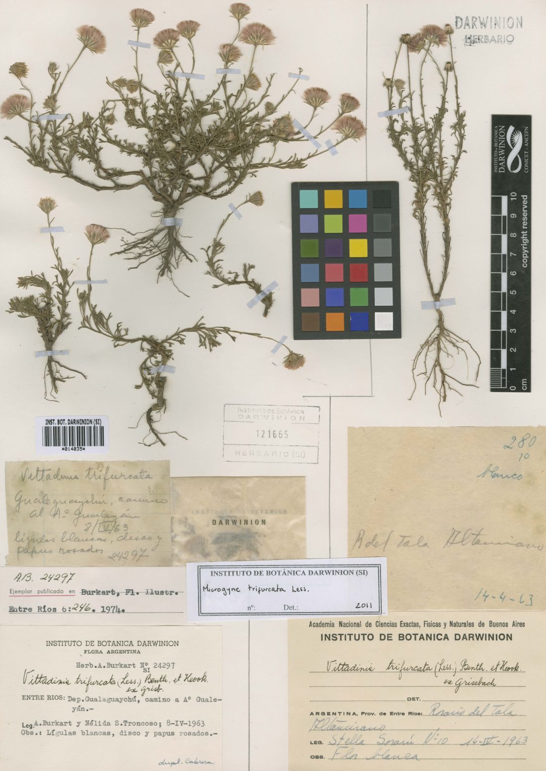 Hierbas perennes, hasta de 35 cm de alto; raíz principal desarrollada; tallos ramosos erectos o ascendentes, hojosos, lanuginosos. Hojas sésiles, glandulosas y laxamente pubescentes, las inferiores tripartidas, de 10-25 mm de largo, abrazadoras, 3-fidas en al ápice, con lóbulos lineares de 5-10 × ca. 1 mm; las superiores enteras, de 8-15 × ca. 1 mm, estrechamente lineares. Capítulos solitarios, pedunculados, de 6-7 × 4-5 mm. Involucro ovado-acampanado con filarios desiguales dispuestos en 2-4 series, oblongos, de 3,2-7 × 0,4-1 mm, agudos y fimbriados en el ápice, glandulosos y aracnóideo-pubescentes. Flores marginales en 1 o raro 2 series, con corola blanca, ligulada, de 5- 7 mm, limbo de 2-3 × 0,6-1,7 mm, ápice cortamente 2 ó 3 dentado, que apenas excede los filarios; flores del centro con corola verdoso-amarilla, tubular-infundibuliforme, de 3,3-4,5 mm de largo. Aquenios de 3,5-5,5 × 0,6-0,8 mm, densamente seríceos. Papus de 3,5-6,5 mm de largo.