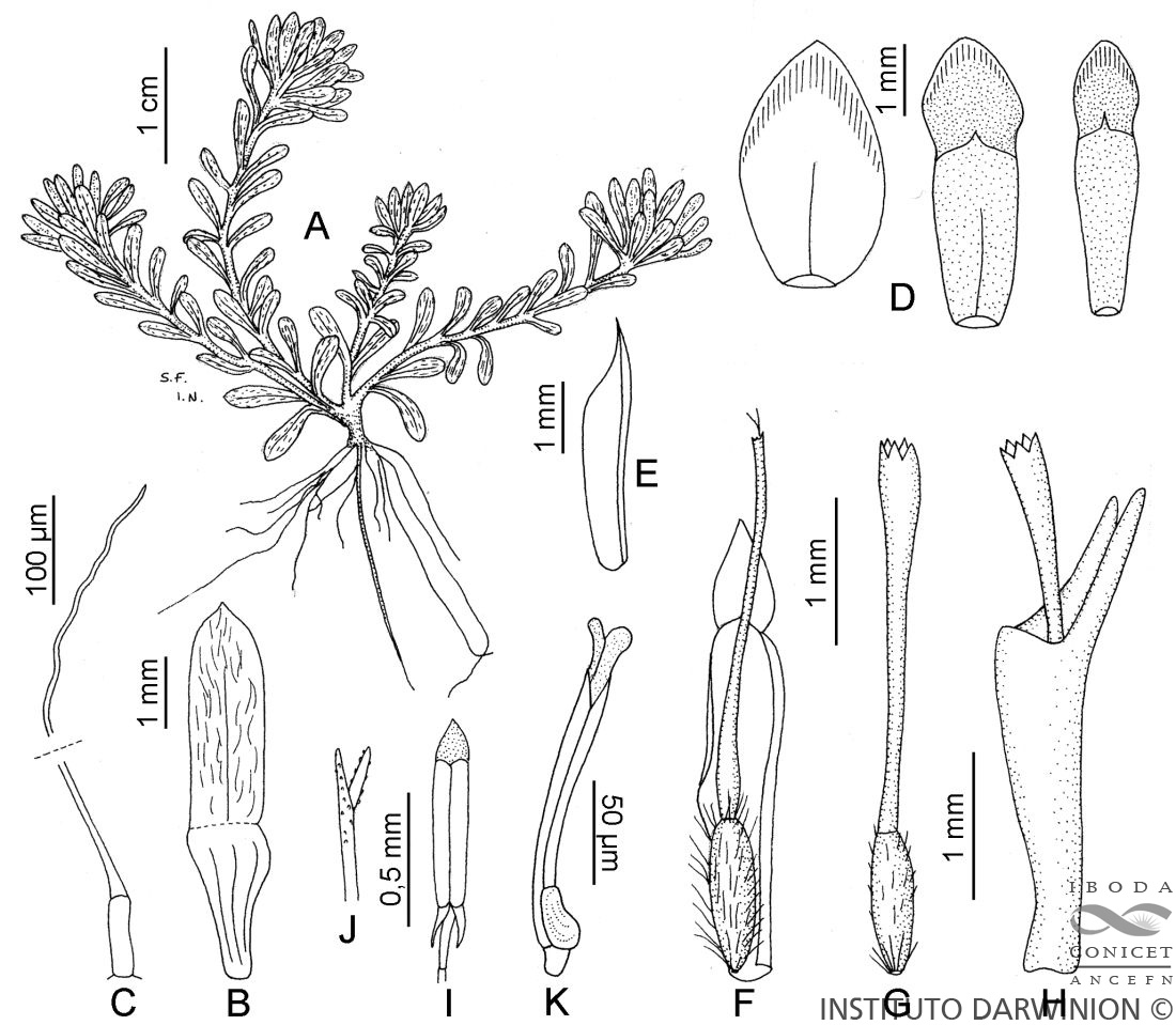 A. Planta. B. Hoja. C. Pelo foliar. D. Filarios, externo a interno de izquierda a derecha. E. Pálea de la flor marginal. F. Flor del margen con su pálea. G. Flor del centro. H. Flor del centro con su pálea. I. Estambre. J. Parte superior del estilo. K. Pelo doble, mucilaginoso, del aquenio. Tomado de Fl. Paraguay 27: 54, fig. 18. 1998.