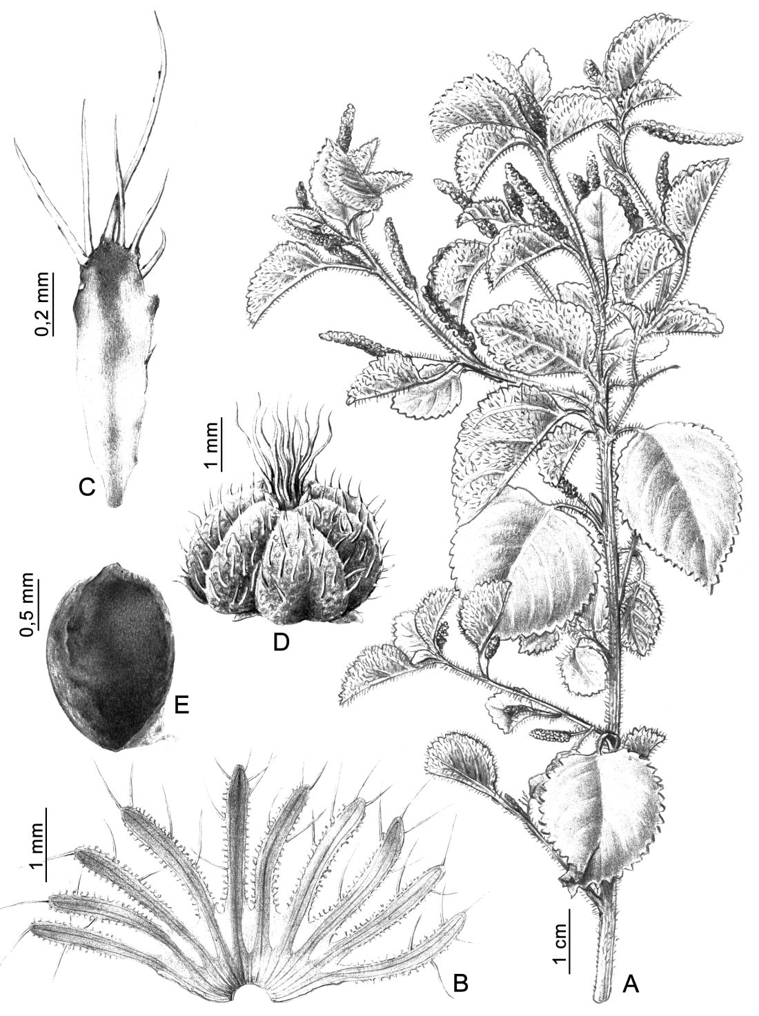 Subarbusto hasta de 50 cm de alto, erecto o decumbente; ramas ascendentes, las jóvenes cubiertas por un denso indumento velutino-híspido de tricomas simples. Hojas con pecíolo de (0,5-)1(-1,7) cm de largo, con indumento similar al de las ramas jóvenes; estípulas filiformes, diminutas; lámina foliar ovado-triangular a suborbicular, de 1,2-3,6 × 1,7-3,6 cm, a veces ligeramente conduplicada, ápice agudo, base truncada o cuneada, margen dentado; cara adaxial y abaxial pubescentes; nerviación pinnatipalmada, con 3(-5) nervios en la base y 3-4 pares de nervios secundarios, membranáceas. Inflorescencias 1-sexuales, espiciformes. Inflorescencias pistiladas de (2-)4(-8) cm de largo, laxifloras, terminales; brácteas hasta de 4 mm de largo, acrescentes en el fruto, margen partido hasta un poco más de la mitad de su longitud, con 9-11 dientes linear-lanceolados, con tricomas simples de 0,5 mm de largo y con papilas cristalíferas. Inflorescencias estaminadas de (0,8-)1,5(-2,5) cm de largo, axilares, raquis pubescente; brácteas linear-obovadas, de 0,2 × 0,6 mm, con tricomas simples. Flores pistiladas sésiles, solitarias en cada bráctea; sépalos 3, ovado-lanceolados, de 1,2 × 0,5 mm, con tricomas simples y ápice muricado; ovario de 0,9 mm de largo, densamente híspido; estilos libres en la base, ca. 1,2 mm de largo, papilosos, laciniados. Flores estaminadas de 0,5 mm de diámetro en botón; sépalos de 0,5 mm de largo, con tricomas simples. Flores alomórficas no observadas. Fruto una cápsula de 2,5 × 3,2 mm, hirsuto-pilosa. Semillas piriformes, de 1-1,3 × 1,6 mm, lisas.