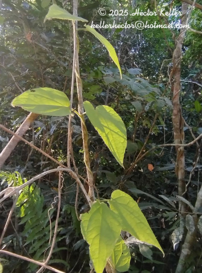 Enredaderas perennes, de tallos multiestriados con pubescencia muy abundante. Hojas opuestas, pecioladas, con pecíolos de 1,5-5 cm de largo y láminas cordiformes, de 4-14 × 2- 9 cm, de margen liso o cortamente denticulado y ápice caudado, hirsutas, con pelos de color castaño en la haz, y con pelos flexibles, más largos y muy abundantes en el envés; domacios «en bolsillo», basales, centrales y laterales, pero no en todas las intersecciones de las nervaduras; estípulas ausentes. Capítulos muy numerosos, pedunculados, dispuestos en inflorescencias paniculiformes terminales y axilares. Involucro de (4,5-)6-7 mm de alto; filarios oblongos u oblongo-lanceolados, de 1-1,6 mm de ancho, de ápice agudo, glabros o poco pilosos; bractéola ovada, de (3,5-)5,5-6 × (1,6-)2,4-3 mm, acuminada, glabra o poco pilosa. Flores con corola blanca, tubulosa, de 4-5 mm de largo, tubo de 1,8-2,2 mm y limbo acampanado de 2,3-2,8 mm de largo, dividido en lóbulos de 1-1,2 mm de largo. Aquenios pilosos de 3 mm de largo. Papus blanco, de 4,5-5 mm de largo, compuesto por 25-45 aristas.