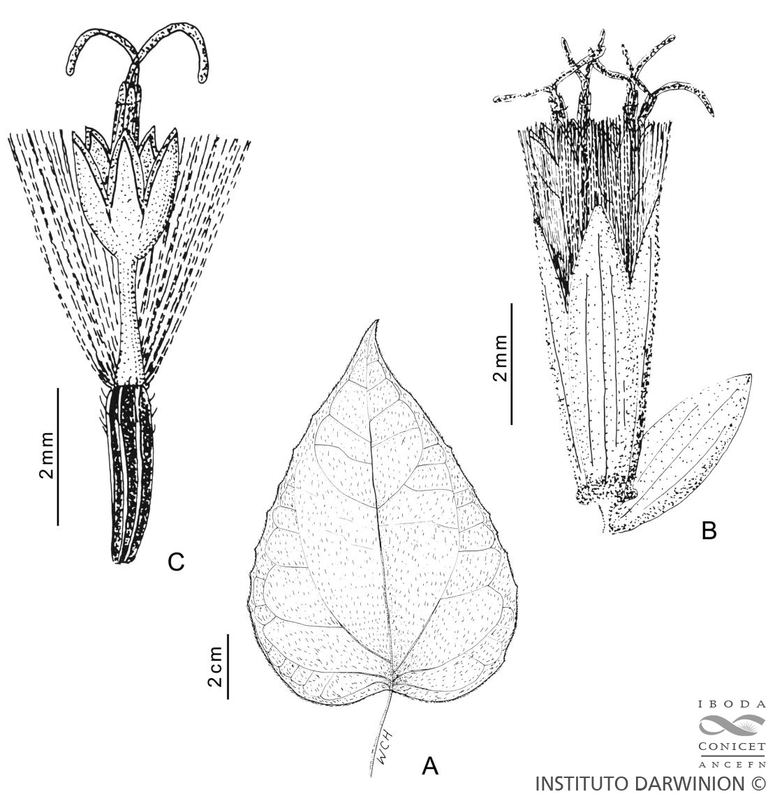 A. Hoja. B. Capítulo. C. Flor. Tomado de Fl. Paraguay 25: 244, fig. 96. 1996.