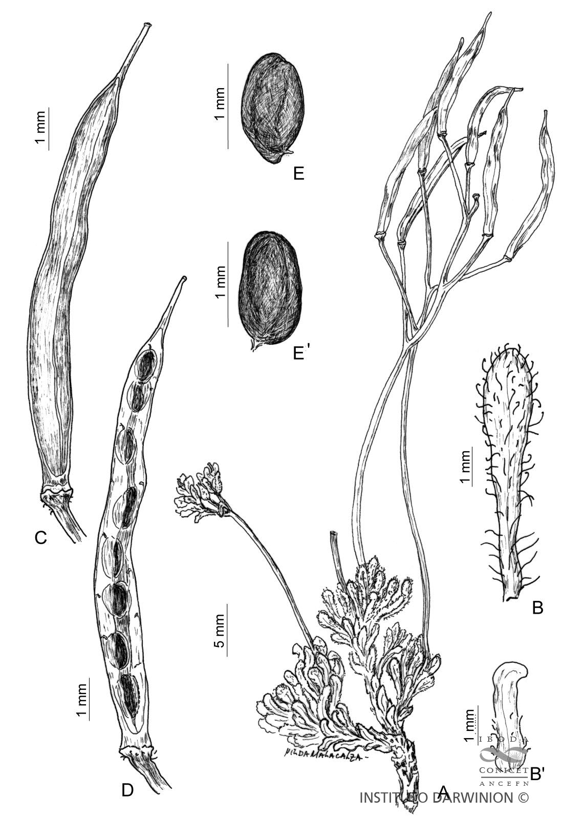 A. Planta. B. Hoja superior. B’. Hoja inferior. C. Silicua. D. Silicua, corte longitudinal. E y E’. Semillas.