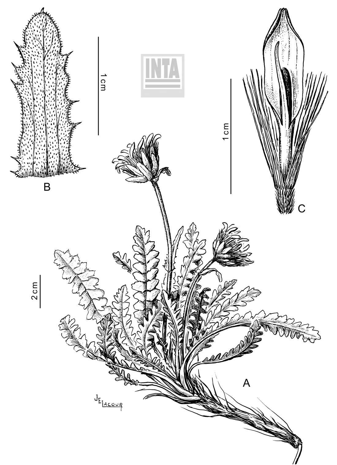 Hierbas acaules, de 8-20 cm de alto, glanduloso-pubescentes. Hojas inferiores dispuestas en roseta, con corto pecíolo envainador, lanceoladas, oblongo-oblanceoladas, de 4-12 × 3-6 cm, pinnatipartidas, lóbulos opuestos o semialternos, frecuentemente algo imbricados, ovado-oblongos, obtusos o semiagudos, enteros o con 1 ó 2 dientes gruesos en el margen, anchos y decurrentes a lo largo del raquis en la base, densamente glanduloso-pubescentes; hojas superiores ausentes o 1 ó 2, bracteiformes, lineares a linear-oblanceoladas. Capítulos solitarios sobre 1-3 escapos. Involucro de 14-25 × 14-30 mm; filarios 3-4-seriados, oblongo-lanceolados a oblongos, agudos en el ápice, glanduloso-pubescentes, los internos con margen escarioso. Flores 15-30, corola azul, las del margen con tubo de 7-8 mm de largo, labio exterior de 10-12 mm de largo. Aquenios truncados en el ápice, densamente velludos, con tricomas rojobroncíneos. Papus de 10-12 mm de largo, leonado.