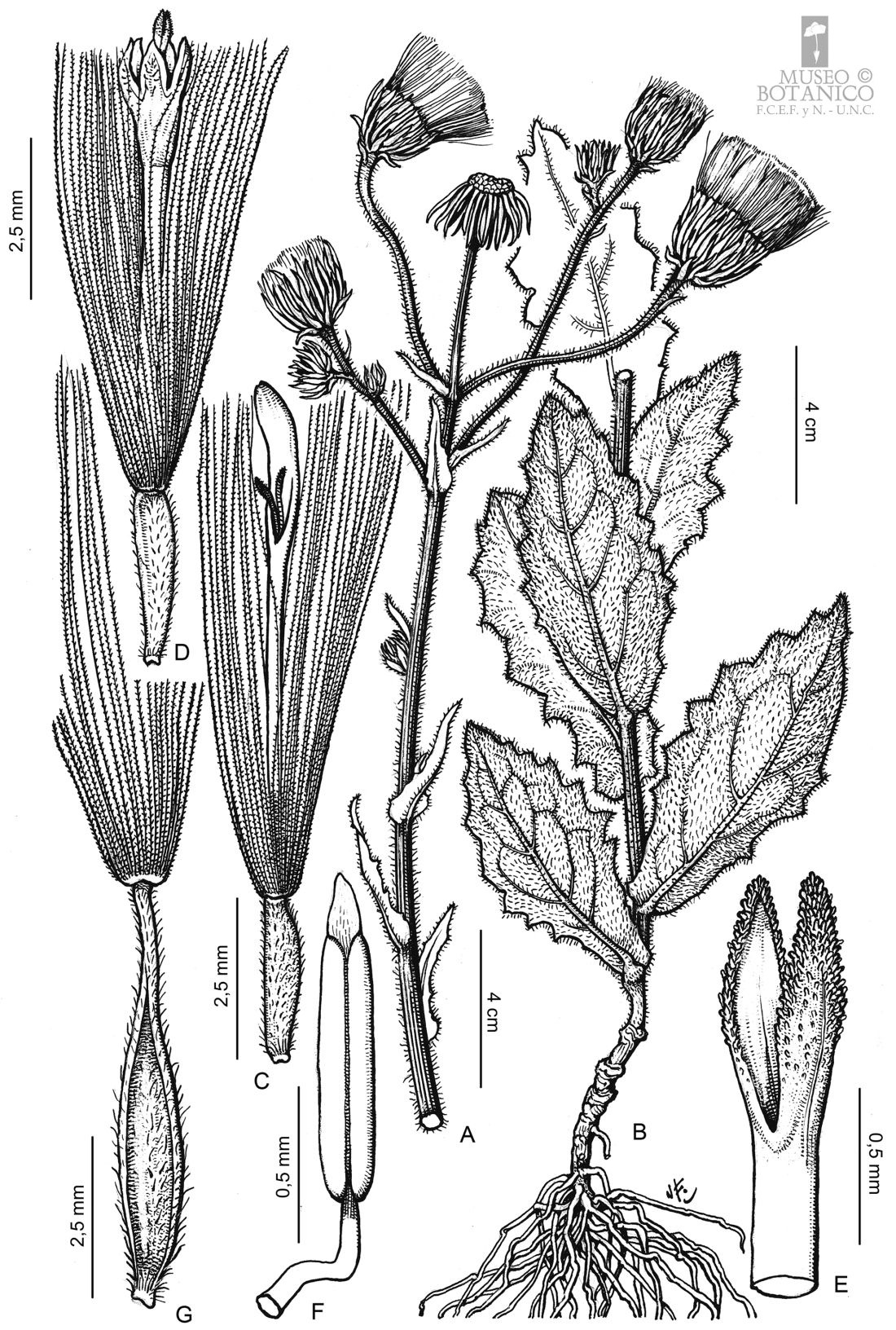 A, B. Planta. C. Flor del margen. D. Flor del centro. E. Estilo (sección). F. Estambre. G. Aquenio con papus.