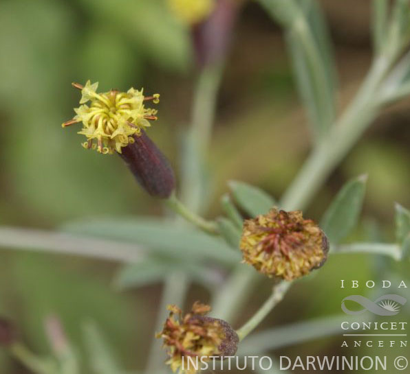 Hierbas anuales, monoicas, de 30-80 cm de alto, glabras, glaucas; tallos simples en la base, ramificados en el ápice. Hojas inferiores opuestas, las superiores alternas, sésiles o con pecíolo breve y ancho; láminas linear-lanceoladas hasta lanceoladas, de 2-8 cm × 5-10 mm, base atenuada, margen entero, grisáceas, con glándulas oleíferas marginales. Capítulos solitarios en el ápice de cada rama, dispuestos sobre pedúnculos cortos, formando pseudocorimbos o pseudoracimos muy laxos. Involucro tubuloso; filarios 5, oblongos, de 15-20 mm de largo, de ápice agudo-acuminado, con 2 hileras de glándulas lineares. Flores 20-30, perfectas, con corola tubulosa, de 6-8 mm de largo, amarilla a violácea, con tubo angosto y limbo ensanchado. Aquenios linear-alargados, de 7-8 mm de largo, oscuros, pilosos, con carpopodio breve. Papus blanco-amarillento, de 8-10 mm de largo.