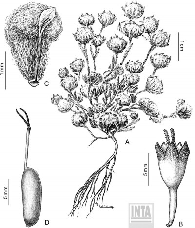 Hierbas anuales, lanosas, ca. 6 cm de alto. Tallos débiles, tendidos, laxamente hojosos en la parte media y densamente hojosos alrededor de los capítulos. Hojas desde oblongolanceoladas hasta lanceoladas, de 5-25 × 1,3-6 mm, ensanchadas hacia la base y agudas en el ápice. Capítulos en el ápice y axila de la dicotomía del tallo, más o menos esféricos, de 6-14 mm de alto. Receptáculo a veces lobado. Flores del margen 8-28, corolas ca. 1,5 mm de largo, envueltas por los filarios (comúnmente llamados páleas) apenas visibles por el indumento, de 3-4 mm de largo; flores del centro 5-8, corolas ca. 1,6 mm de largo. Aquenios levemente comprimidos, de 1-2 mm de largo