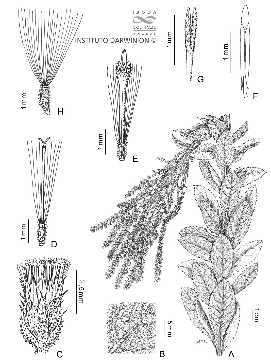 A. Rama florífera. B. Detalle de la cara abaxial de la hoja. C. Capítulo. D. Flor del margen. E. Flor del centro. F. Estambre. G. Parte superior del estilo. H. Aquenio y papus