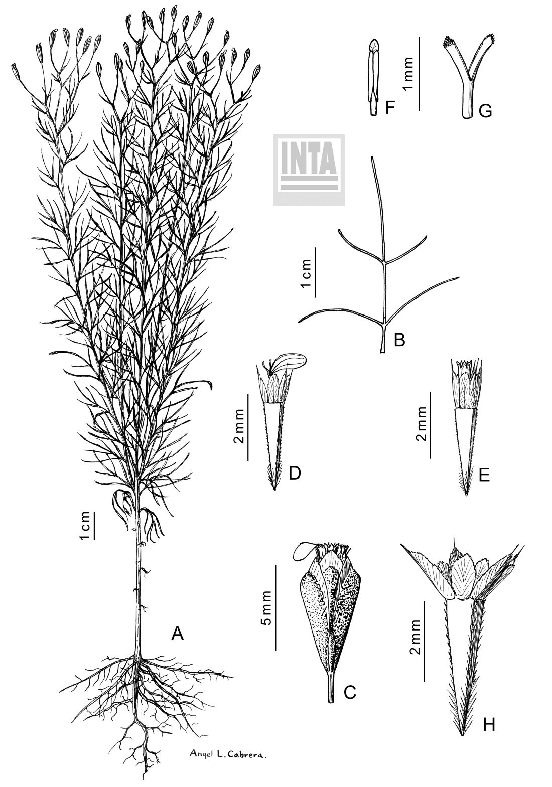 A. Planta. B. Hoja. C. Capítulo. D. Flor del margen. E. Flor del centro. F. Estambre. G. Parte superior del estilo. H. Aquenio y papus.