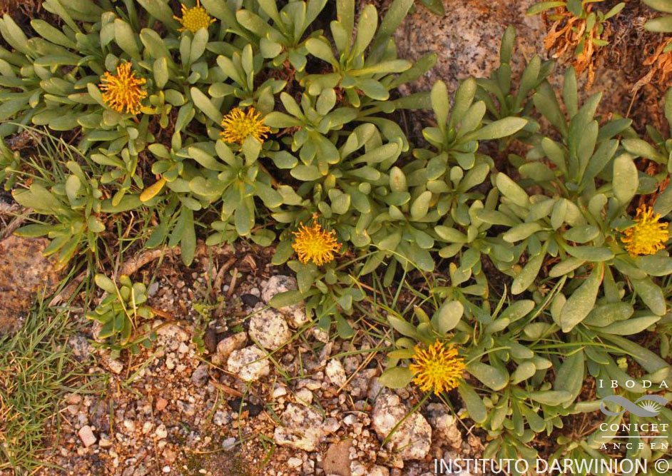 Sufrútices bajos, de 4-6 cm de alto, muy ramificados, glabros; tallos tendidos o ascendentes, muy densamente hojosos. Hojas espatuladas, de 1-3,5 cm × 2-5 mm, atenuadas en la base en un largo pseudopecíolo envainador, obtusas en el ápice, enteras en el margen, glabras en ambas caras. Capítulos discoides, solitarios en los ápices de los tallos, más o menos envueltos por las hojas superiores. Involucro acampanado, de 7,5-10 × 8-12 mm; brácteas del calículo pocas, lineares, alcanzando la mitad del involucro; filarios ca. 15, oblongo-lineares, agudos, glabros. Flores isomorfas, numerosas, con corolas amarillas, tubulosas de 5-7,5 mm de largo, 5-lobada, lóbulos de 0,7 mm de largo. Aquenios cilindroides, ca. 3 mm de largo, costados, glabros. Papus blanco, de 5,5-8 mm de largo.