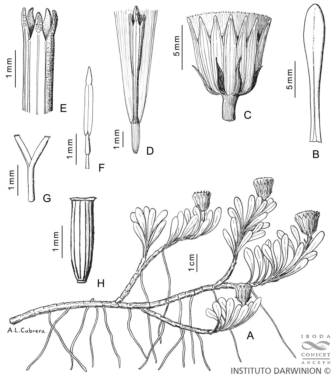 Sufrútices bajos, de 4-6 cm de alto, muy ramificados, glabros; tallos tendidos o ascendentes, muy densamente hojosos. Hojas espatuladas, de 1-3,5 cm × 2-5 mm, atenuadas en la base en un largo pseudopecíolo envainador, obtusas en el ápice, enteras en el margen, glabras en ambas caras. Capítulos discoides, solitarios en los ápices de los tallos, más o menos envueltos por las hojas superiores. Involucro acampanado, de 7,5-10 × 8-12 mm; brácteas del calículo pocas, lineares, alcanzando la mitad del involucro; filarios ca. 15, oblongo-lineares, agudos, glabros. Flores isomorfas, numerosas, con corolas amarillas, tubulosas de 5-7,5 mm de largo, 5-lobada, lóbulos de 0,7 mm de largo. Aquenios cilindroides, ca. 3 mm de largo, costados, glabros. Papus blanco, de 5,5-8 mm de largo.