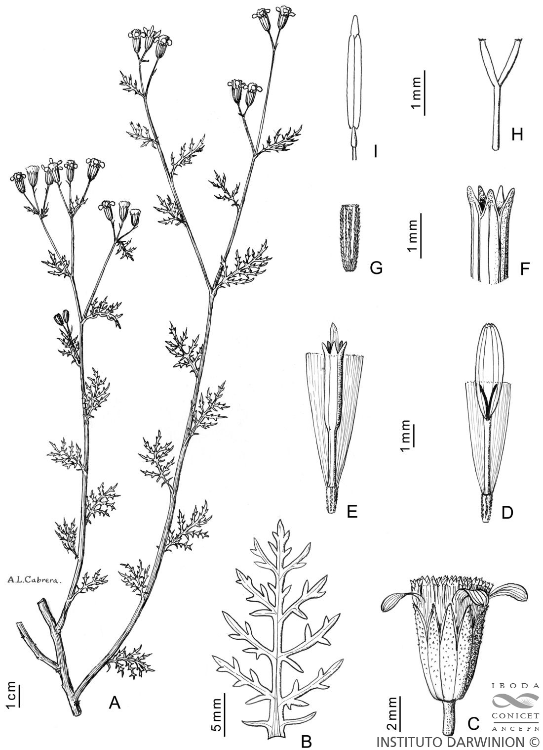 Arbustitos ca. 50 cm de alto, glabros o levemente glandulosos; tallos delgados, laxamente hojosos. Hojas alternas, sésiles, planas o levemente revolutas en los bordes, bipinnatisectas, con raquis de 15-45 × 0,5-2,5 mm y 3-5 pares de segmentos lineares, agudos o subobtusos, de 6-8 mm, con 2-3 lobulitos lineares a cada lado, raramente enteros. Capítulos radiados, dispuestos en cimas corimbiformes paucicéfalas en el extremo de las ramas, largamente pedunculados, con pedúnculos ebracteados. Involucro acampanado, de 5-7 × ca. 4 mm, ecaliculado; filarios 10-13, oblongo-lineares, agudos y penicilados en el ápice, cortamente glanduloso-papilosos. Flores dimorfas, con corolas amarillas, las del margen 5-10, con corolas liguladas, lígula de 4-4,5 × 1,2-1,5 mm; flores del centro 14-25, con corolas tubulosas de 6,5-8 mm de largo, 5-lobadas, lóbulos de 0,6-0,7 mm de largo. Aquenios cilindroides, ca. 1,5 mm de largo, costados, corta y apretadamente papiloso-pubescentes. Papus blanco de 5-6 mm de largo.