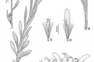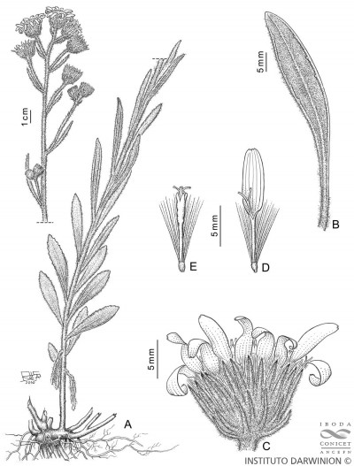 Hierbas perennes de 40-60 cm de alto, laxamente albotomentosas; tallos erectos, ramosos en la base, hojosos hasta la inflorescencia. Hojas disupuestas densamente; láminas linear-lanceoladas, de 7-10 × 6-8 mm, algo atenuadas en la base, agudas en el ápice, algo revolutas y cortamente dentadas o enteras en el margen, laxamente lanosas o glabrescentes en la haz y densamente tomentosas en el envés. Capítulos poco numerosos, radiados, dispuestos en cimas corimbiformes terminales; pedúnculos tomentosos, de 1-5 cm de largo. Involucro acampanado, de 10-12 × 12-14 mm; brácteas del calículo pocas, lineares y cortas; filarios ca. 20, lineares, agudos en el ápice, tomentulosos en el dorso. Flores dimorfas, las del margen ca. 20, con corolas de color anaranjado, liguladas, lígula elíptica de unos 15 × 4 mm; flores del centro muy numerosas, con corolas tubulosas de 10-12 mm de largo. Aquenios cilindroides, cortísimamente papilosos o glabros. Papus blanco.