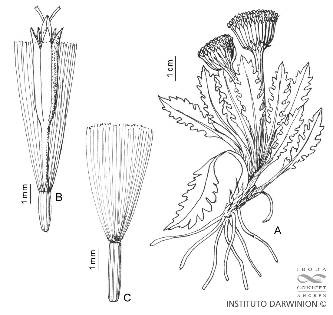 Hierbas perennes, subacaules, de 3-15 cm de alto, laxamente lanuginosas o glabrescentes; tallos escapiformes y bracteolados, simples o bifurcados. Hojas arrosetadas, oblanceolado-lineares, de 2-7 cm × 5-12 mm, largamente atenuadas en la base en un pecíolo envainador, agudas en el ápice, enteras o más o menos profundamente lobadas. Capítulos discoides, solitarios en el ápice del escapo o de sus ramificaciones. Involucro hemisférico, de 9-11 × 15-25 mm, brácteas del calículo numerosas, lineares, cortas y lanosas en el dorso; filarios 22-26(-35), lineares, glabros en el dorso y penicilados en el ápice. Flores isomorfas, muy numerosas, con corolas tubulosas, ca. 6 mm de largo, 5-lobadas, lóbulos ca. 0,5 mm de largo. Aquenios cilindroides, ca. 3 mm de largo, costados, glabros. Papus blanco, ca. 6 mm de largo.