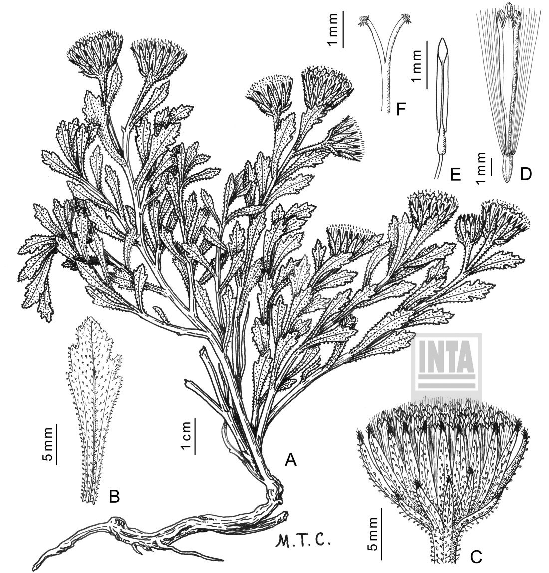 A. Planta. B. Hoja. C. Capítulo. D. Flor. E. Estambre. F. Porción superior del estilo.