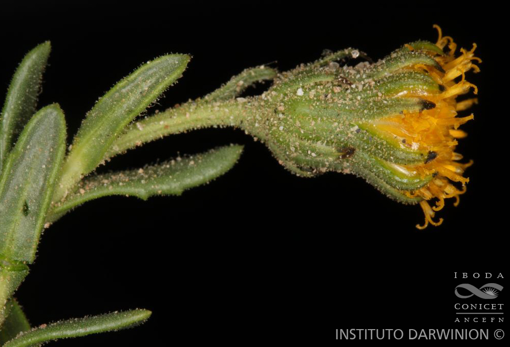 Hierbas perennes, de 5-10 cm de alto, densamente glanduloso-pubescentes; tallos ramosos en la base, ascendentes o decumbentes, hojosos hasta el ápice. Hojas alternas, sésiles; láminas oblanceoladas, de 6-15 × 2-3 mm, atenuadas en la base, agudas o subobtusas en el ápice, con 1-3 dientes a cada lado, glanduloso-pubescentes en ambas caras. Capítulos discoides, pedunculados, solitarios en el extremo de las ramas o agrupados de a 2-3; pedúnculos glandulosos de 5-12 mm de largo. Involucro acampanado, de 8-10 × 8-10 mm; brácteas del calículo pocas, lineares, negruzcas en el ápice y glandulosas en el dorso, apenas alcanzando la mitad del involucro; filarios 13-18, oblongo-lineares, oscuros en el ápice, glandulosos en el dorso. Flores isomorfas, numerosas, con corolas tubulosas de 7-8 mm de largo, 5-lobadas, lóbulos ca. 0,7 mm de largo. Aquenios cilindroides, de 3-4 mm de largo, glabros. Papus blanco.