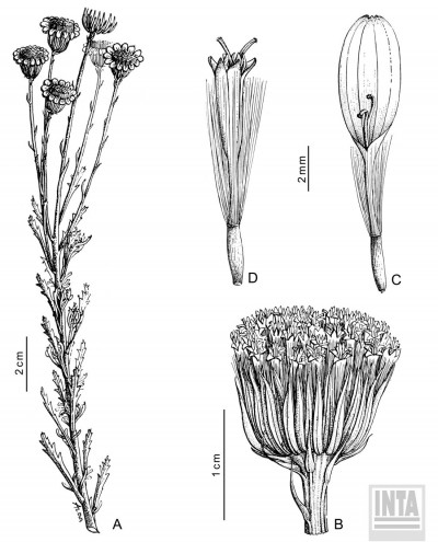 Sufrútices erectos, de 15-30 cm de alto, ramosos en la base, glabros o ligeramente glandulosos; tallos densamente hojosos, divididos superiormente en 2-5 ramitas casi desnudas. Hojas espatuladas, de 2-3,5 × hasta 1 cm, atenuadas en la base en pseudopecíolo, profundamente dentadas o lobadas, con 1-3 dientes o lóbulos a cada lado. Capítulos radiados o discoides, dispuestos en número de 2-5 en pseudocorimbos terminales. Involucro anchamente acampanado, ca. 10 × 15 mm; brácteas del calículo estrechamente lineares, cortas; filarios 25-28, oblongo-lineares, atenuados en el ápice y levemente áspero-glandulosos en el dorso. Flores isomorfas o dimorfas, las del margen (cuando presentes) ca. 15, con corolas amarillas, liguladas, lígula elíptica de unos 7 mm de largo; las del centro muy numerosas, con corolas amarillas, tubulosas, ca. 9 mm de largo, 5-lobadas, ca. 0,7 mm de largo. Aquenios glabros. Papus blanco.