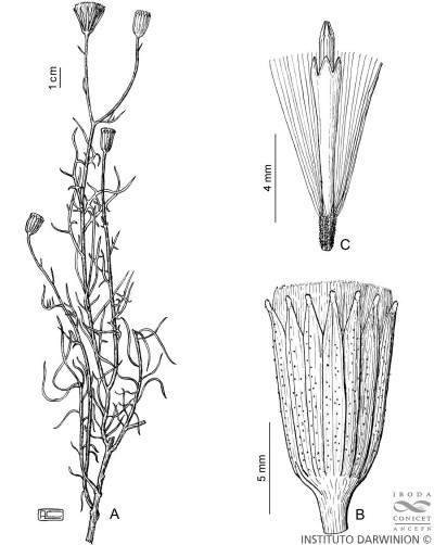 Sufrútices erectos, de 20-30 cm de alto, ramosos, glabérrimos; tallos gráciles, laxamente hojosos, simples o bifurcados una o dos veces en la parte superior donde son casi áfilos. Hojas dimorfas: unas estrechamente lineares, de 3-5 cm × ca. 1 mm, agudas, enteras, otras profundamente pinnatisectas, con 1-2 pares de segmentos estrechamente lineares, agudos. Capítulos discoides, solitarios en los ápices de los tallos o bien formando una cima muy laxa 2-4-céfala. Involucro cilíndrico, de 10-14 × ca. 8 mm, ecaliculado; filarios 13-16, lineares, agudos y oscuros en el ápice, glabros o ligeramente áspero-glandulosos. Flores 30-50, isomorfas, con corolas tubulosas de unos 7 mm de largo, 5-lobadas, lóbulos ca. 0,4 mm de largo. Aquenios cilindroides, costados, cortamente pubescentes. Papus blanco.