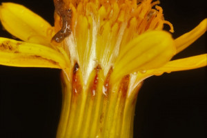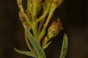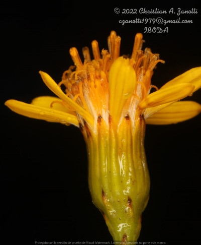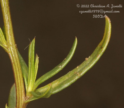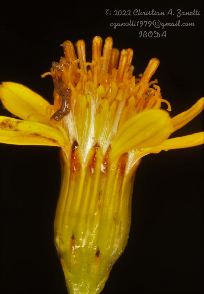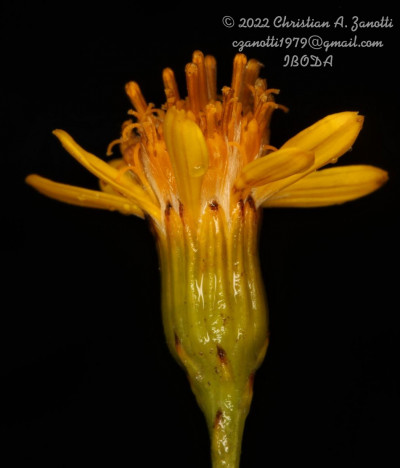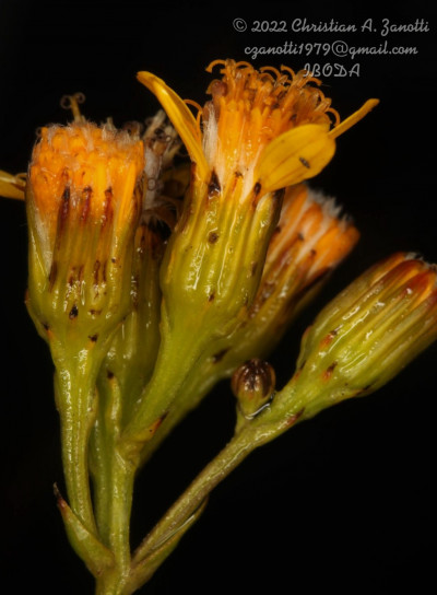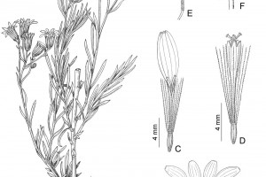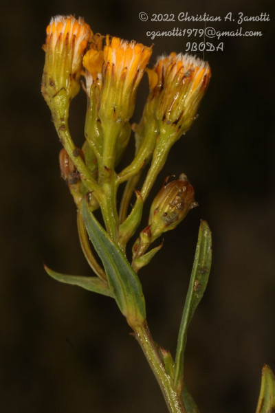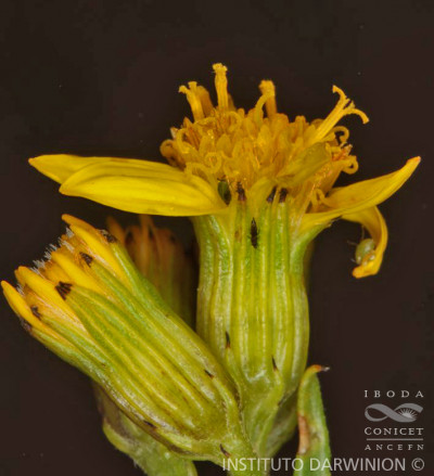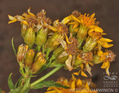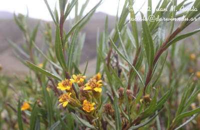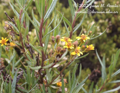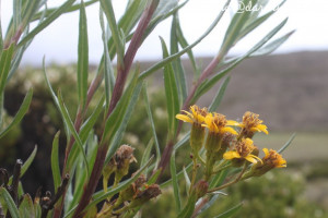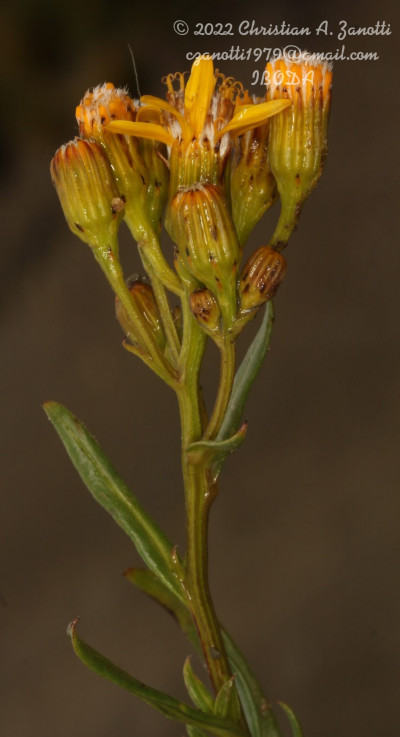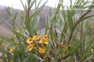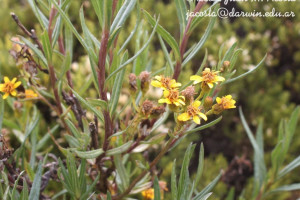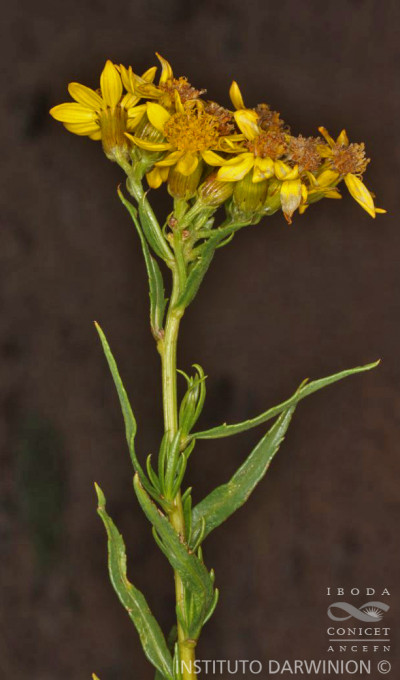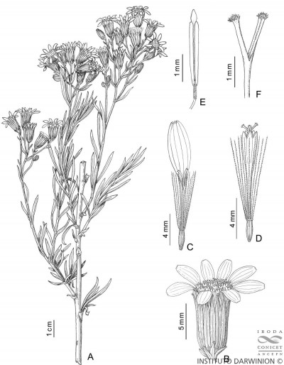Arbustos glabros, de 0,50-1 m de alto; tallos densamente hojosos hasta la inflorescencia. Hojas alternas, sésiles, con láminas lineares a linear-lanceoladas, de 2-4(-7) cm × 1-2 (10) mm, atenuadas en breve pseudopecíolo en la base, agudas en el ápice, revolutas en el margen, enteras o aserradas hasta casi lobadas, glabras en ambas caras. Capítulos numerosos, radiados, dispuestos en cimas corimbiformes terminales; pedúnculos de 3-25 mm de largo. Involucro acampanado, de 6-8 × 5-6 mm; brácteas del calículo pocas, lineares, cortas; filarios 12-14, oblongos, agudos, glabros en el dorso. Flores dimorfas, las del margen 8-12, con corolas amarillas, liguladas, lígula elíptica de 5-8 × 2-2,5 mm; las del centro ca. 25, con corolas tubulosas, de 7-8 mm de largo, 5-lobadas. Aquenios cilindroides, ca. 4 mm de largo, costados, glabros o ligeramente papiloso-pubescentes. Papus blanco.