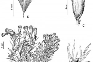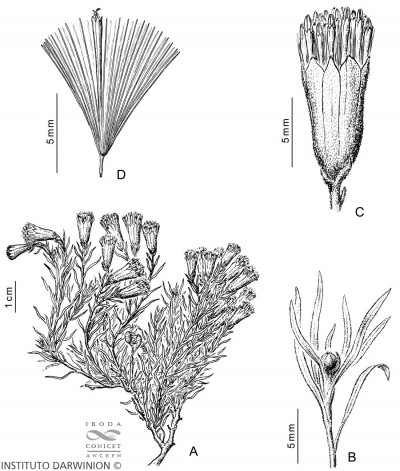 Sufrútices enanos, laxamente ramosos, de 4-10 cm de alto, albo-tomentosos; tallos hojosos hasta el ápice. Hojas alternas, con láminas estrechamente lineares, de 5-12 × 0,5-1 mm, agudas en el ápice, enteras, albo-tomentosas en ambas caras. Capítulos discoides, solitarios o en cimas corimbiformes paucicéfalas; pedúnculos ca. 0,5 mm de largo. Involucro cilíndrico, de 6-7 × 3,5-4 mm, apenas caliculado; brácteas del calículo pocas y cortísimas; filarios 8, oblongos, agudos u obtusos y penicilados en el ápice, laxamente tomentosos en el dorso. Flores isomorfas, 18-20, con corolas rosadas, tubulosas, de 6-7 mm de largo, cortamente 5-lobadas, lóbulos ca. 0,5 mm de largo. Aquenios cilindroides, ca. 5 mm de largo, costados, glabros. Papus blanco ca. 7 mm de largo.