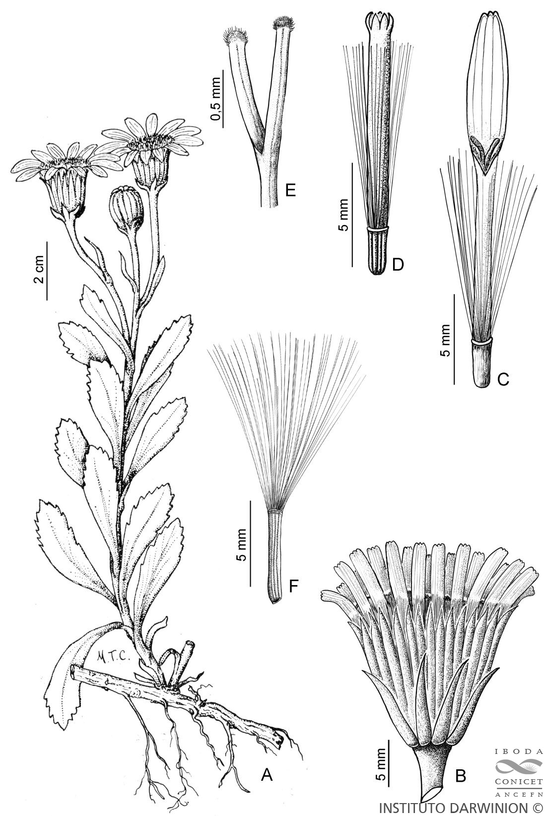 A. Planta. B. Capítulo. C. Flor del margen. D. Flor del centro. E. Porción superior del estilo. F. Aquenio con papus.