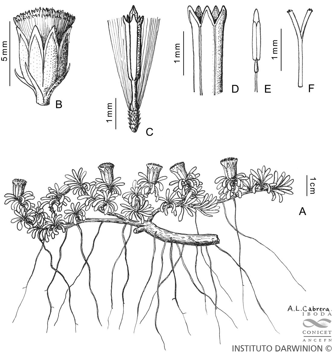 Hierbas perennes, pigmeas, cespitosas, formando cojines de 1-2 cm de alto, glabras; tallos tendidos, cortos, radicantes, densamente hojosos. Hojas frecuentemente subarrosetadas, lineares, de 3-10 × 0,5-1 mm, atenuadas y semienvainadoras en la base, obtusas en el ápice, enteras en el margen, algo carnosas, glabras en ambas caras. Capítulos discoides, sésiles y solitarios en el extremo de cortas ramitas. Involucro acampanado, ca. 5 × 3-4 mm; brácteas del calículo pocas, lineares, alcanzando la mitad del involucro; filarios 8, oblongos, a veces manchados de oscuro en el ápice, glabros en el dorso. Flores isomorfas, 15-18, con corolas amarillas, tubulosas, de 4-5 mm de largo, 5-lobadas. Aquenios cilindroides, seríceo-pubescentes o glabros. Papus blanco.