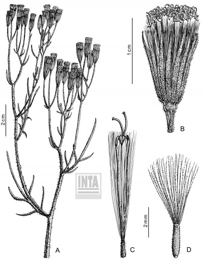 Sufrútices ramosos en la base, densamente albo-tomentosos, de 30-40 cm de alto. Tallos hojosos hasta la inflorescencia. Hojas pinnatisectas, con raquis linear, de 4-6 cm × 1 mm y 2-4 pares de segmentos lineares, enteros, de 6-20 × 0,5-1 mm. Capítulos discoides, dispuestos en cimas corimbiformes laxas, paucicéfalas, en los ápices de los tallos. Involucro acampanado, ca. 10 × 5 mm; brácteas del calículo pocas, lineares, cortas; filarios 8-11(-12), lineares, agudos, tomentosos en el dorso. Flores isomorfas numerosas, con corolas blancas, amarillas o rosadas, tubulosas, ca. 7,5 mm de largo, cortamente 5-lobadas, lóbulos ca. 0,6 mm de largo. Aquenios cilindroides, ca. 2 mm de largo, costados, densamente seríceo-pubescentes.