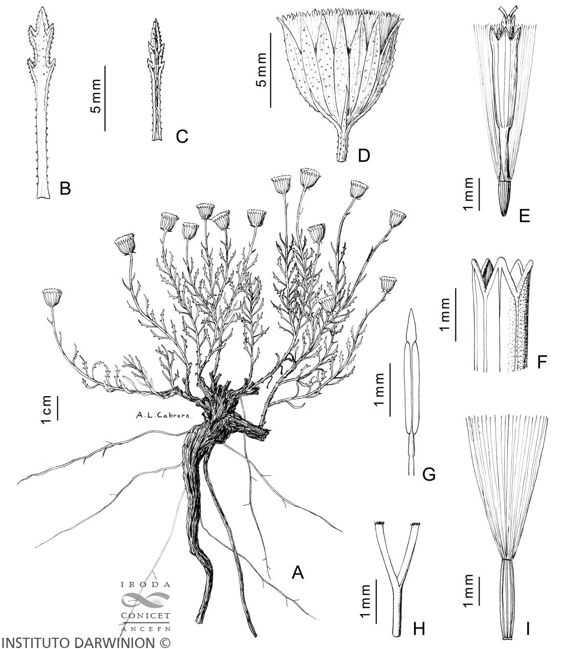 A. Planta. B-C. Hojas. D. Capítulos. E. Flor. F. Ápice de la corola. G. Estambre. H. Porción superior del estilo. I. Aquenio y papus.