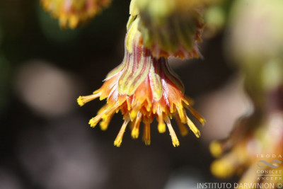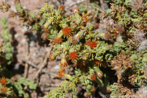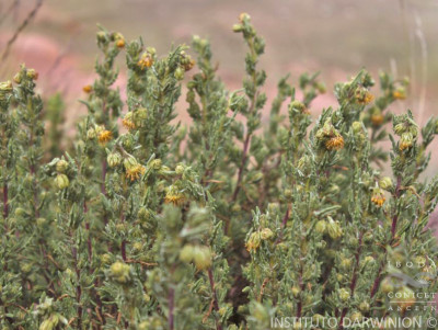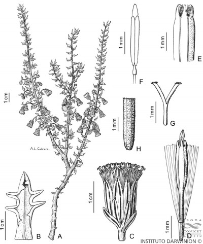 Arbustitos densamente ramosos, de 20-50 cm de alto, resinosos, fragantes, glabros; tallos densamente hojosos hasta el ápice. Hojas sésiles, aparentemente fasciculadas, oblongo-lineares, de 3-12 × 2-7 mm, subobtusas en el ápice, con 1-4 pares de dientes grandes, notablemente revolutas en el margen, raramente enteras, carnosas. Capítulos discoides, nutantes, en los ápices de ramitas laterales muy cortas, cortamente pedunculados, formando en conjunto pseudoracimos. Involucro acampanado, de 6-7,5 × 5-6 mm; brácteas del calículo 5-6, oblongas, con una bolsa oleífera en el dorso, alcanzando la mitad del involucro; filarios 6-12, lanceolado-oblongos, subobtusos en el ápice y con 1-2 bolsas oleíferas sobre la nervadura. Flores isomorfas, 12-30, con corolas rosadas, anaranjadas o amarillas, tubulosas, ca. 7 mm de largo, 5-lobadas, lóbulos triangulares, ca. 0,7 mm de largo. Aquenios cilindroides, de 3-3,5 mm de largo, costados, cortamente pilosos o glabros. Papus blanco de 6-6,5 mm de largo.