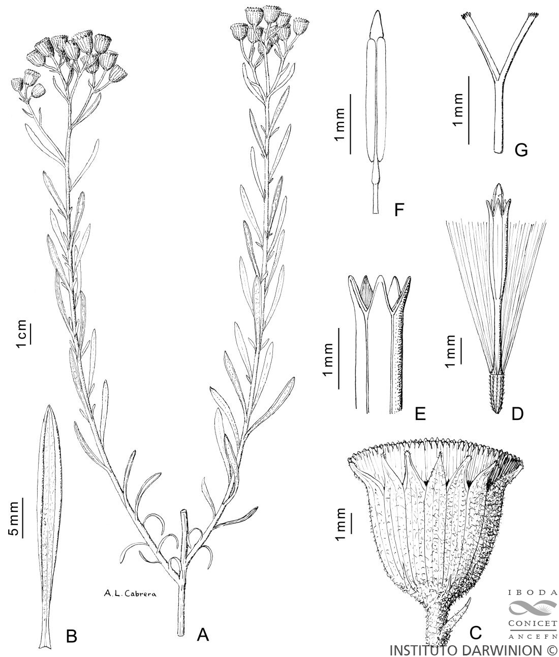 Sufrútices de 40-60 cm de alto, albo-tomentosos; tallos erectos, ramosos en la parte inferior, abundantemente hojosos. Hojas sésiles, lanceolado-lineares o lineares, de 10-60 × 1,5-5 mm, atenuadas en la base, subobtusas en el ápice, revolutas en el margen, enteras o con 1-2 dientes profundos a cada lado, lanosas o glabrescentes en la cara superior y densamente tomentosas en la inferior. Capítulos discoides, 2 a numerosos, largamente pedunculados, dispuestos en cimas corimbiformes laxas. Involucro acampanado, de 6-7 × 7-8 mm; brácteas del calículo pocas, lineares, cortas; filarios 13-20, oblongo-lineares, agudos en el ápice, lanosos o glabrescentes en el dorso. Flores isomorfas, numerosas, con corolas tubulosas, ca. 7 mm de largo, cortamente 5-lobadas, lóbulos triangulares, ca. 0,5 mm de largo. Aquenios cilindroides, costados, glabros o laxamente papilosos. Papus blanco ca. 6 mm de largo.