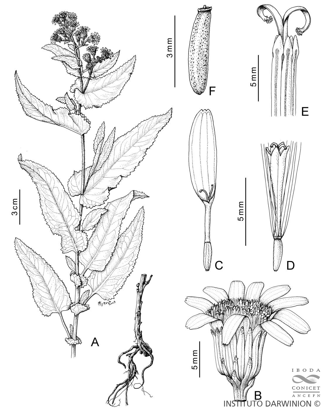 A. Planta. B. Capítulo. C. Flor del margen. D. Flor del centro. E. Ápice de la corola de una flor del centro, con las ramas estigmáticas exertas. F. Aquenio.