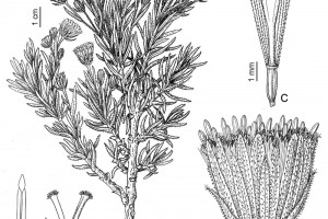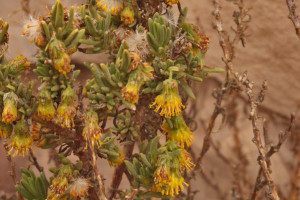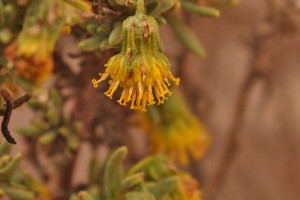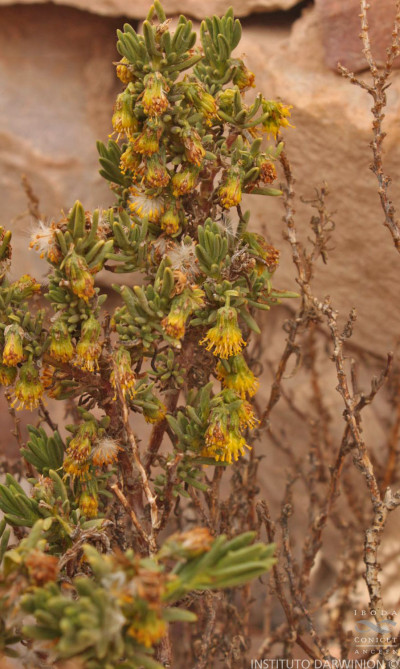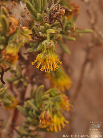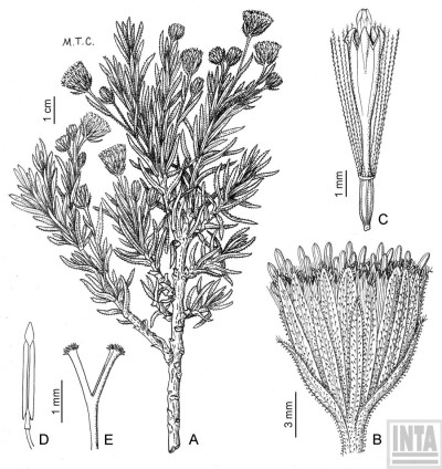Arbustos achaparrados, densamente ramosos, de 20-60 cm de alto, glanduloso-hirsutos; tallos densamente hojosos. Hojas alternas, sésiles, lineares o linear-oblongas, de 12-30 × 1-5 mm, agudas u obtusas, enteras y revolutas en el margen, algo carnosas, más o menos glanduloso-pubérulas en ambas caras. Capítulos discoides, solitarios o dispuestos en cimas corimbiformes 2-4-céfalas; pedúnculos de 5-20 mm de largo, bractéolados, glanduloso-pubérulos. Involucro acampanado, de 6-10 × 6-10 mm; brácteas del calículo pocas, lanceoladas, alcanzando la mitad o son tan largas como el involucro; filarios 10-16, desiguales, unos lineares, agudos, otros oblongos, obtusos, todos con 1-3 bolsas oleíferas longitudinales. Flores isomorfas, numerosas, con corolas amarillas, tubulosas, ca. 6 mm de largo, 5-lobadas. Aquenios cilindroides, costados, glabros. Papus blanco de unos 6 mm de largo.