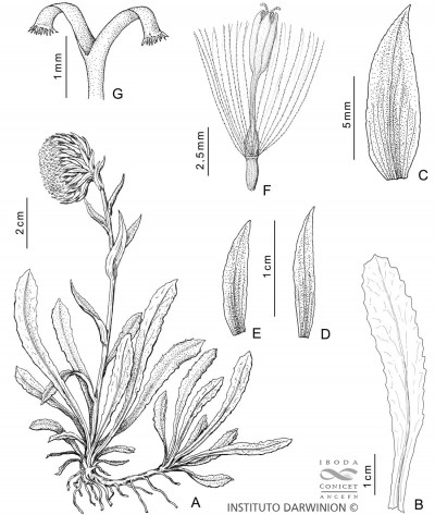 Hierbas perennes, de 10-30 cm de alto, ligeramente lanuginosas o glabras; tallos simples, escapiformes. Hojas inferiores arrosetadas, oblanceoladas, de 5-10 cm × 5-10 mm, atenuadas y envainadoras en la base, subobtusas en el ápice, aserrado-dentadas en el margen, ligeramente lanuginosas o glabras en ambas caras; las caulinares lanceoladas, sésiles y semiabrazadoras en la base, atenuadas en el ápice, gradualmente menores y bracteiformes. Capítulos discoides, solitarios en los ápices de los tallos, nutantes. Involucro violáceo, hemisférico, de 10-15 × 20-40 mm; brácteas del calículo numerosas, lanceoladas, casi tan largas como el involucro; filarios 30-40, sub 2-seriados, lanceolados, agudos en el ápice, glabros y con 3 nervaduras oscuras en el dorso. Flores isomorfas, muy numerosas, con corolas amarillas, tubulosas, de 6-9 mm de largo, cortamente 5-lobadas. Aquenios cilindroides, costados, glabros. Papus blanco, casi tan largo como la corola.