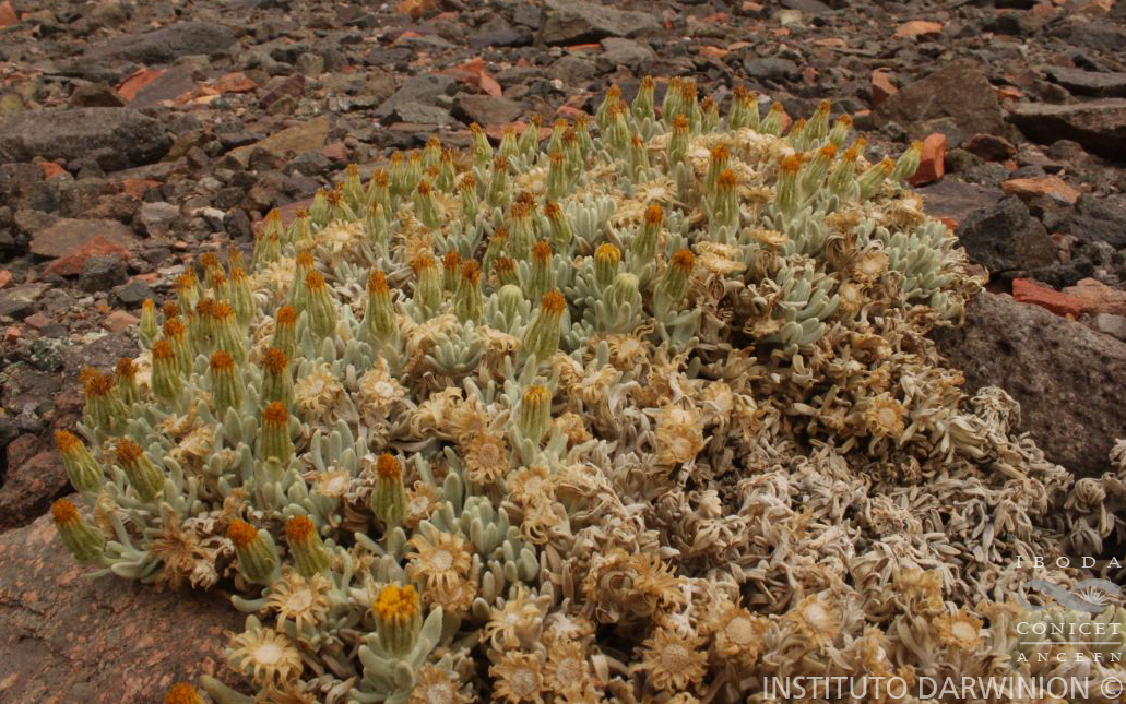 Sufrútices bajos, ramosos, de 4-20 cm de alto, densamente gríseo-tomentosos; tallos ascendentes, densamente hojosos en su parte inferior y casi desnudos en la superior. Hojas alternas, sésiles, linear-oblongas, de 12-25 × 1,5-3 mm, algo atenuadas en la base, obtusas en el ápice, enteras y generalmente revolutas en el margen, densamente tomentosas en ambas caras. Capítulos discoides, solitarios en el extremo de las ramitas. Involucro anchamente acampanado, ca. 10 × 12 mm; brácteas del calículo pocas, cortas; filarios ca. 20, lanceolados, agudos y penicilados en el ápice, laxamente lanosos en el dorso o casi glabros. Flores isomorfas, ca. 40, con corolas amarillentas, tubulosas, ca. 7 mm de largo, cortamente 5-lobadas, lóbulos angostamente triangulares, ca. 0,5 mm de largo. Aquenios cilindroides, costados, glabros. Papus blanco ca. 6,5 mm de largo.