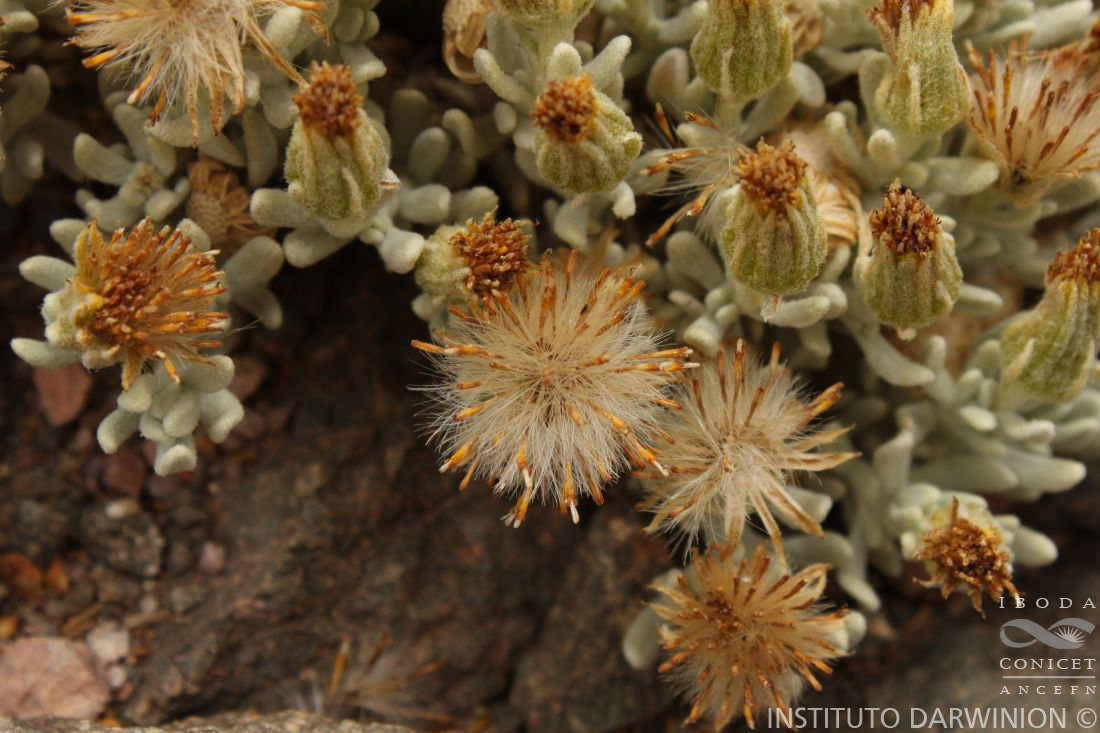 Sufrútices bajos, ramosos, de 4-20 cm de alto, densamente gríseo-tomentosos; tallos ascendentes, densamente hojosos en su parte inferior y casi desnudos en la superior. Hojas alternas, sésiles, linear-oblongas, de 12-25 × 1,5-3 mm, algo atenuadas en la base, obtusas en el ápice, enteras y generalmente revolutas en el margen, densamente tomentosas en ambas caras. Capítulos discoides, solitarios en el extremo de las ramitas. Involucro anchamente acampanado, ca. 10 × 12 mm; brácteas del calículo pocas, cortas; filarios ca. 20, lanceolados, agudos y penicilados en el ápice, laxamente lanosos en el dorso o casi glabros. Flores isomorfas, ca. 40, con corolas amarillentas, tubulosas, ca. 7 mm de largo, cortamente 5-lobadas, lóbulos angostamente triangulares, ca. 0,5 mm de largo. Aquenios cilindroides, costados, glabros. Papus blanco ca. 6,5 mm de largo.